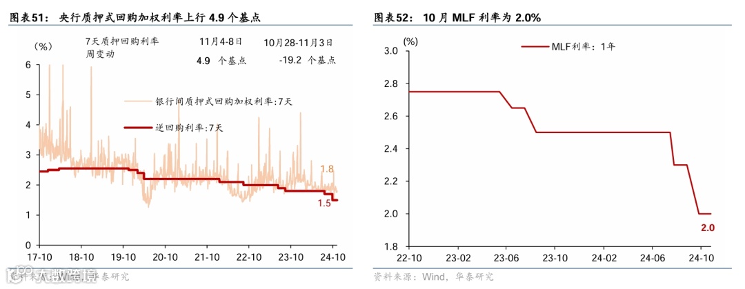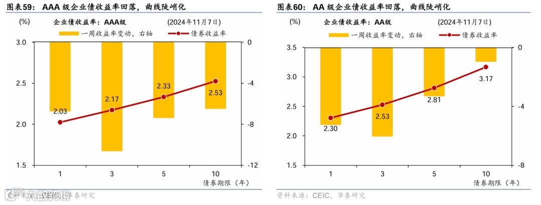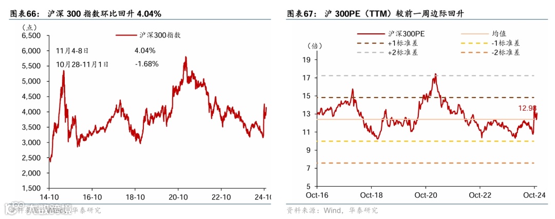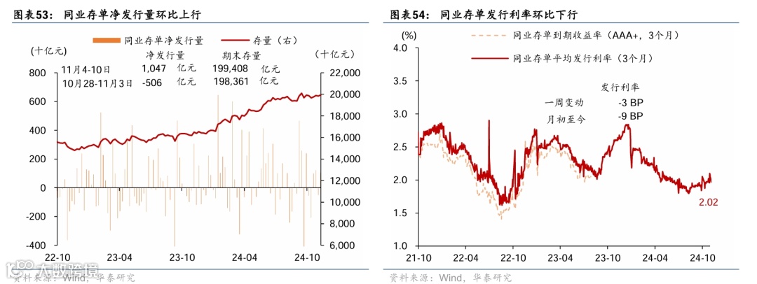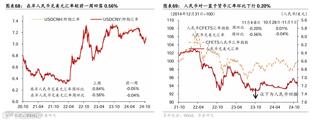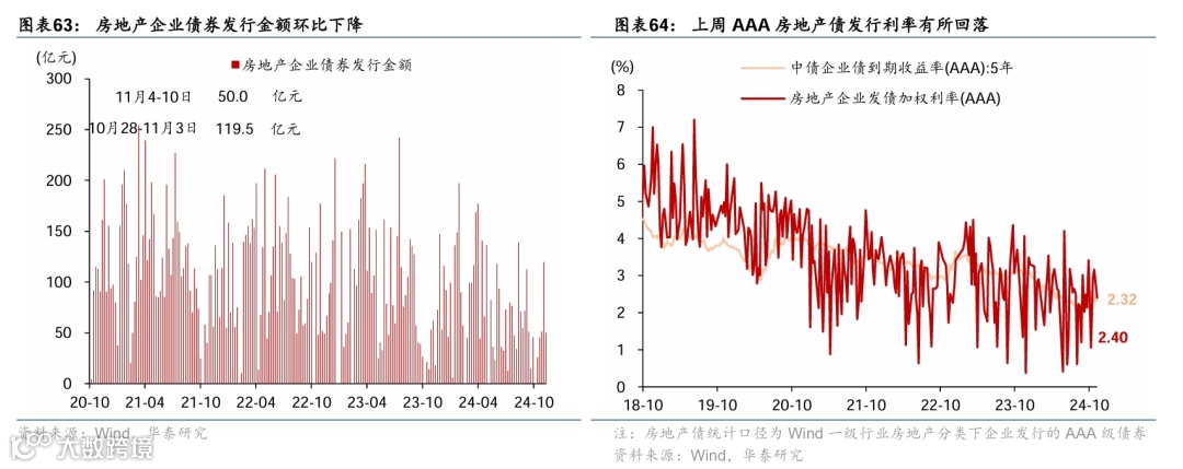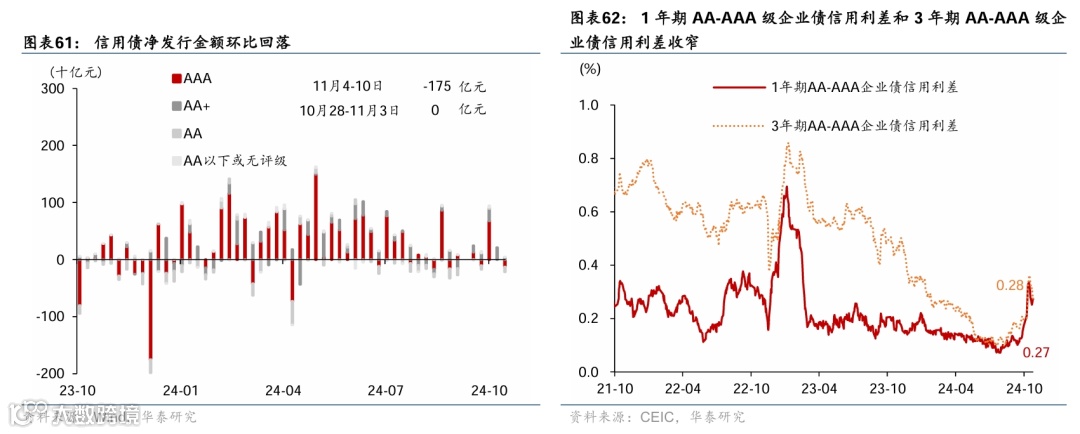 融资及汇率:AAA级企业债收益率、AA级企业债收益率均回落,3年期AA-AAA级企业债信用利差收窄。上周房地产债净发行额、信用债净发行额均环比下降,股权融资额环比回升。上周沪深300指数环比回升4.04%,PE(TTM)估值水平较前一周边际回升。汇率方面,上周人民币兑美元较一周前下行0.56%,对一篮子货币汇率较前一周下行0.20%。此外,上周利率债净赎回783亿元,同比少增1.4万亿元,其中国债同比少增3,765亿元,地方政府债同比少增6,064亿元,政策性银行债同比少增4,139亿元。
