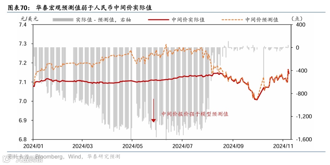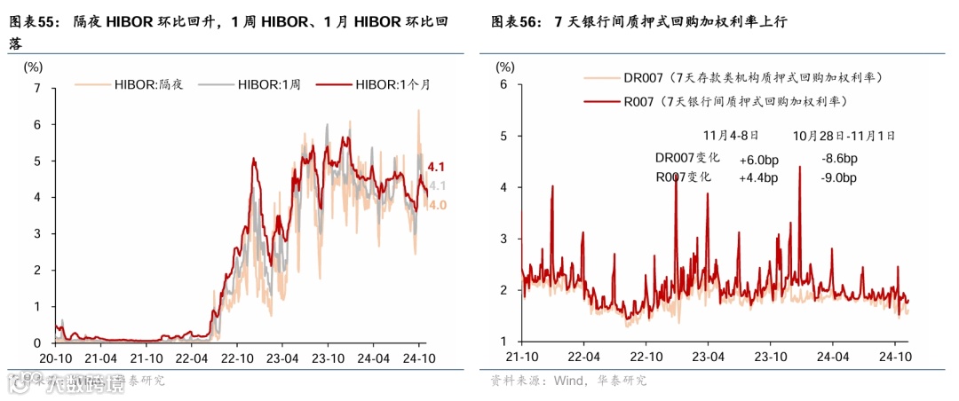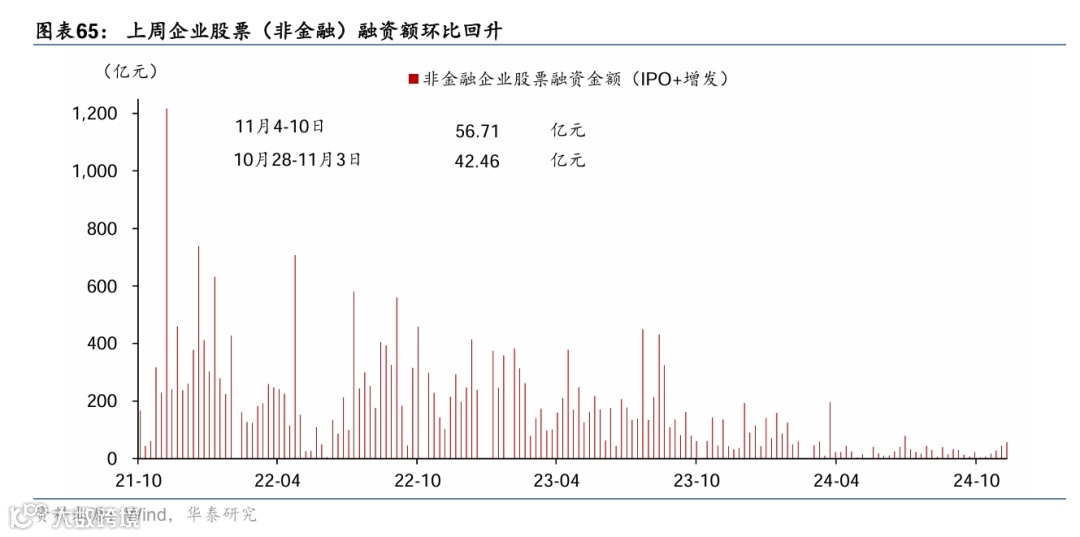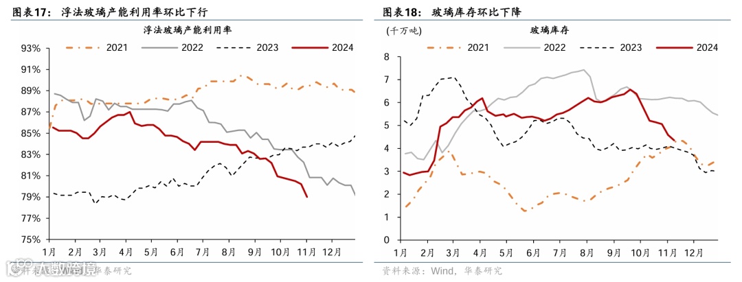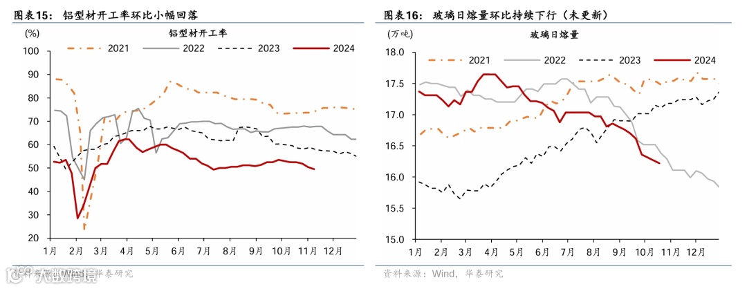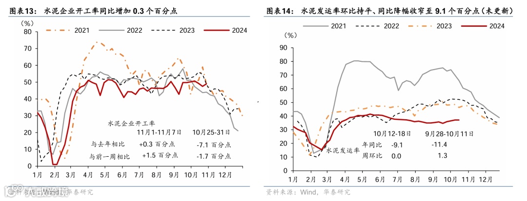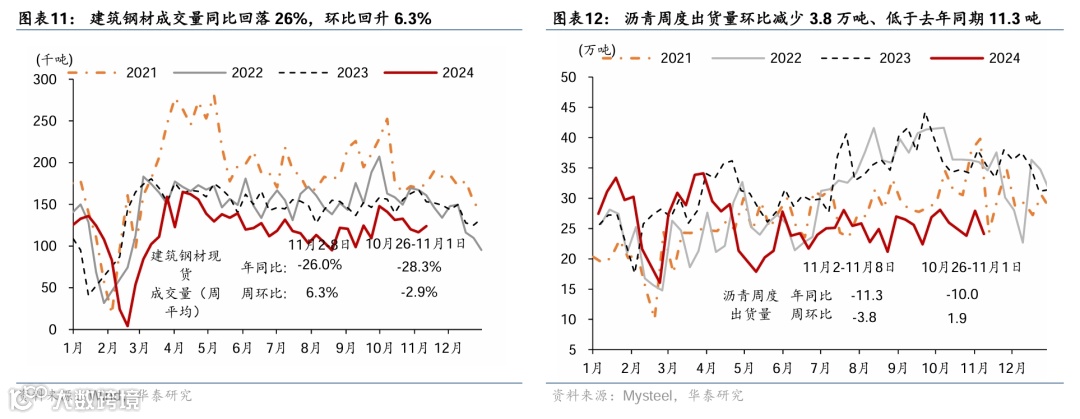 下游:水泥开工率同比和环比均上行,建筑钢材成交同比下降、环比上升。具体看,上周水泥企业开工率环比增速转正至1.5个百分点,同比转正至0.3个百分点。11月2-8日,建筑钢材日均成交量环比转正至6.3%,同比降幅收窄至26%。此外,半钢胎开工率较前一周下行0.1个百分点,但高于2023同期6.2个百分点、或显示汽车供给侧景气度仍较高。与地产竣工相关的浮法玻璃产能利用率环比降低,玻璃库存环比亦边际下行。基建方面,沥青周度出货量环比减少3.8万吨,低于去年同期11.3万吨。