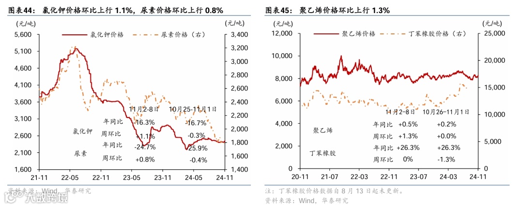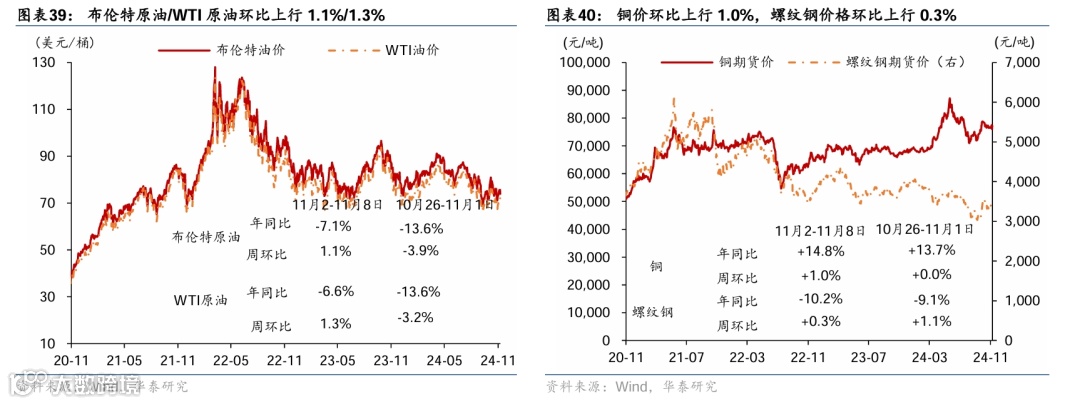 上游:上周国际油价环比上行,金价持续走低。布伦特原油价格环比上行1.1%至73.9美元/桶,WTI原油价格环比上行1.3%至70.4美元/桶。主要受美国大选结束叠加美联储降息25bp扰动;COMEX黄金持续走低至2,692美元/盎司。