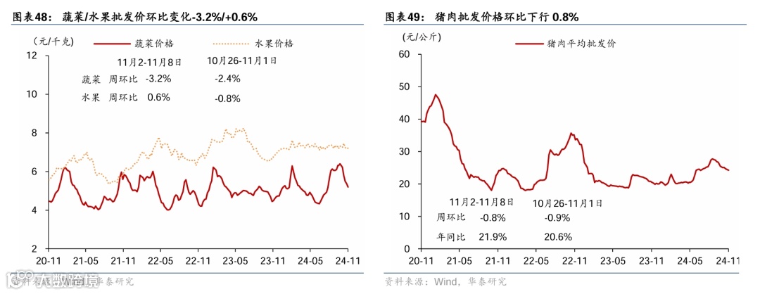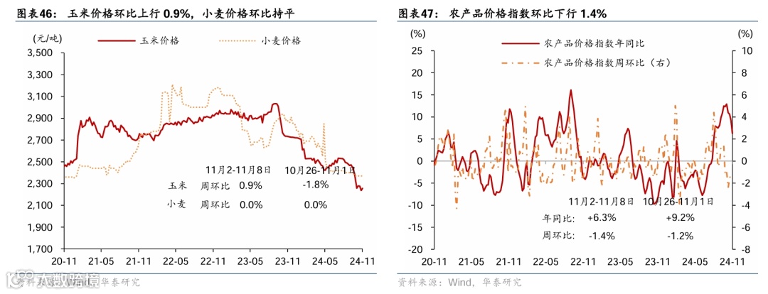 农林牧渔:猪价月均环比转负、生猪养殖仍然录得盈利但环比有所回落。1)猪肉价格11月至今月均环比回落2.9%,需求偏弱仍对猪价回升形成制约;生猪养殖利润周环比回落7.2%,但已连续25周录得正利润,全月平均环比回落12.7%。2)粮价仍在回撤,11月至今玉米价格环比回落1.1%。