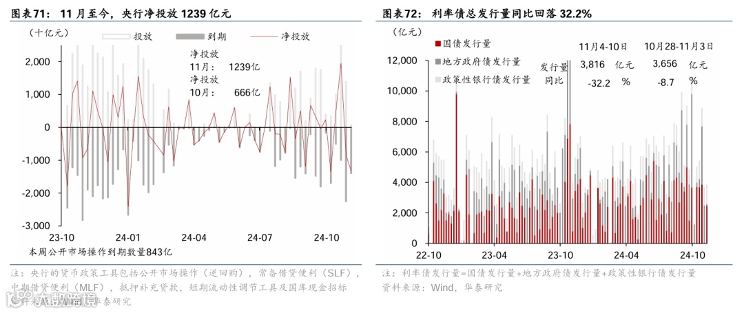 上周工业生产景气度从此前的高位有所回撤,地产成交面积同比回升,其中一线城市新房/二手房同比继续走强,出口保持韧性。10月出口增速超预期上行,通胀指标受食品和油价波动拖累同比回落。人大常委会新闻发布会宣布新增6万亿元的地方专项债限额置换地方存量隐债,有望缓解地方政府现金流压力及可能的溢出效应。本周重点关注10月经济活动数据和社融数据。