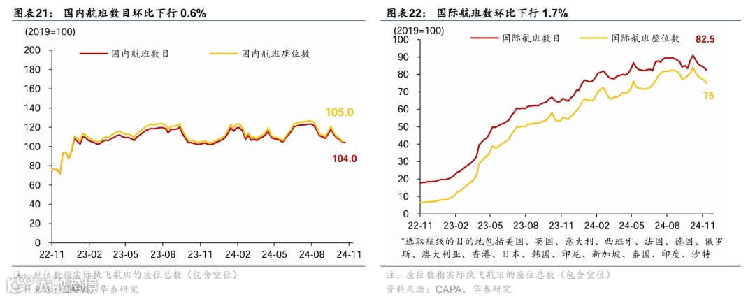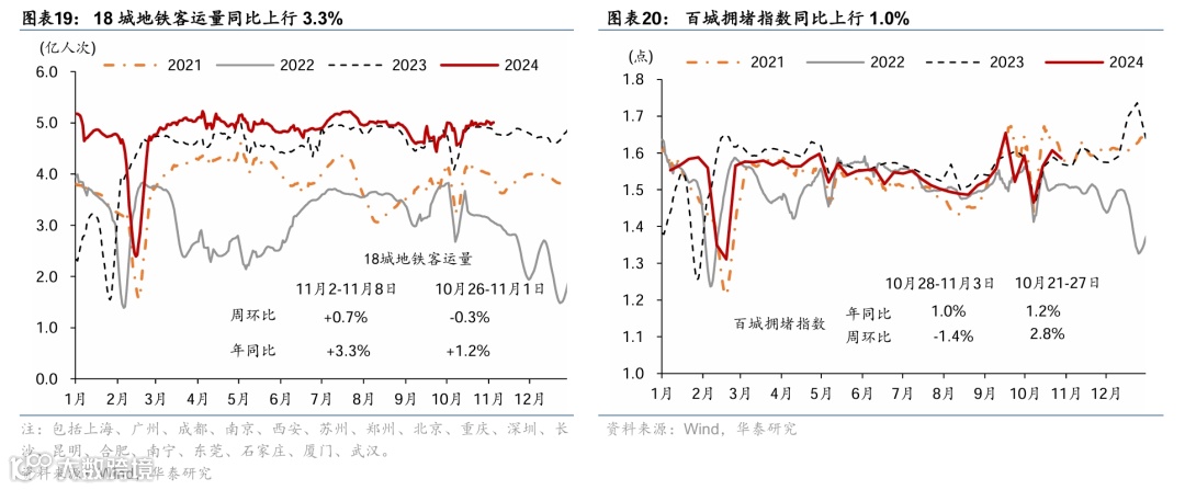 出行活动:百城拥堵指数环比下行、同比增速略有放缓。地铁客运量同比增速上行、环比转正,国内航班/国际航班数量持续回落。11月2-8日,18城地铁客运量周环比转正至0.7%,同比增速较前一周的1.2%上行至3.3%。此外,10月28-11月3日,百城拥堵指数周环比由2.8%下降至-1.4%,同比增速较前一周的1.2%放缓至1.0%。城际/国际出行方面,国内航班数量环比下行0.6%,国际航班数量环比下行1.7%,分别为2019年同期的104%/75%。