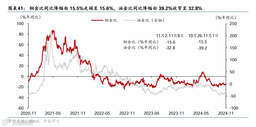 中游:国内铜价、尿素价格环比均上行,水泥、螺纹钢价格环比上行。上周国内铜价环比回升1.0%;10月以来螺纹钢价格持续走高,上周螺纹钢价格环比上行0.3%;企业错峰生产力度加大,工地资金持续改善和基建投资发力拉动水泥需求提升,供需关系改善下近期水泥价格偏强运行,水泥价格环比上行1.1%。铜金比同比降幅由15.5%走阔至15.6%,油金比同比降幅由39.2%收窄至32.8%。动力煤价格环比持平;中游化工品方面,聚乙烯价格环比上行1.3%;上周尿素价格环比上行0.8%。