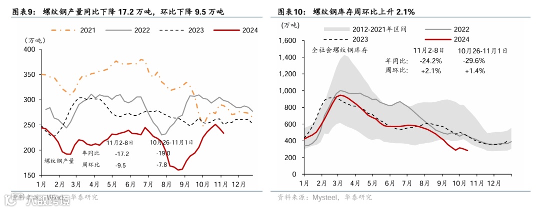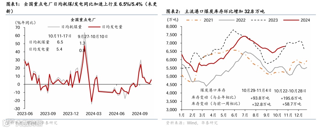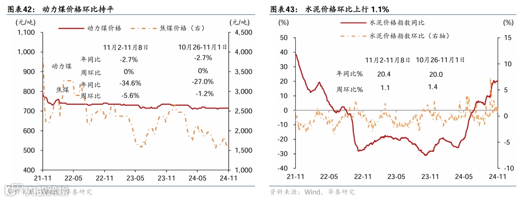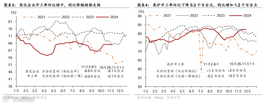 上游:上周(11月2-8日)焦化开工率同比降幅持续走阔、环比持平,高炉开工率同比上行、环比小幅下降。10月11日-17日,全国重点电厂日均耗煤同比增速上行至6.5%,日均发电同比增速从前一周的0.9%上行至5.4%。10月29-11月4日,主流港口煤炭库存环比季节性增加32.8万吨、同比增加93.8万吨。11月2-8日,全国247家样本高炉开工率环比下降0.2个百分点,高于去年同期1.2个百分点。此外,焦化企业开工率环比持平,仍低于去年同期8.6个百分点,同比降幅较前一周边际走阔。