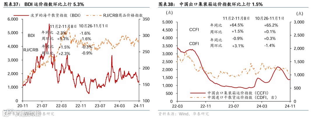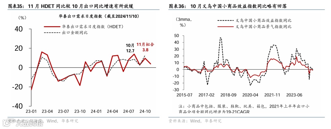 外贸需求:国际航线运价整体回升,中国出口集装箱运价指数环比上行。截至11月8日,中国进口干散货运价指数(CDFI)较前一周环比回升3.1%,BDI指数较前一周环比上行5.3%。此外,高频指标华泰出口需求日度指数(HDET)显示11月环比转正,但较高基数下同比增速较10月有所放缓。
