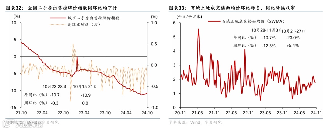 地产需求:上周新房成交面积同比增速从前一周的0.8%上行至11.8%,二手房成交面积同比增速从前一周的16.0%上行至30.0%,其中一线城市二手房成交同比显著回升78.9%。价格方面,二手房挂牌价格指数同环比均下行,土地成交量涨价跌。