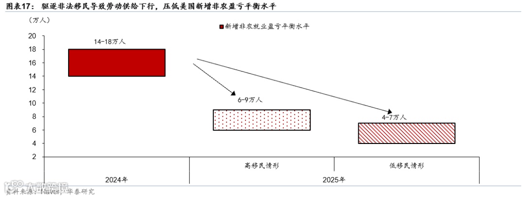 我们认为,驱逐非法移民对美国2025H2劳动供给冲击加大,新增非农就业水平或结构性下降,叠加关税上升对需求的冲击,就业市场短期仍有压力(参见《移民收紧或大幅压低美国“均衡”新增非农水平》,2025/8/11)。2022-2024年美国每年移民净流入290万人,但是特朗普就任以来收紧边境管控,美国西南边境遭遇人数已在2025年7月回落至0.7万人/月,较2022-2024年的18.8万人/月明显回落,我们预计2025年移民流入可能放缓至0附近。我们预计,下半年美国新增非农就业的盈亏平衡水平从2024年的14-18万人放缓至4-7万人(低移民情形)以及6-9万人(高移民情形)(图表17)。此外,8月以来,美国加权关税税率仍在进一步上升,叠加关税滞后传导,三季度总需求和就业市场仍可能面临冲击,就业市场仍可能面临压力。