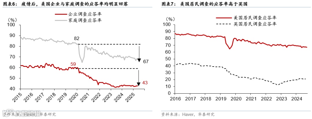 第一,疫情后非农调查应答率显著下降(即样本数下降),以及初值收集率明显回落,导致初值数据不完整,因而波动性变大(图表6)。美国非农企业调查的应答率从疫情前的59%回落至2025年5月的42.9%,这意味着非农的样本量逐步缩小接近三分之一。上述现象在其他发达国家中也存在,美国家庭调查的应答率甚至好于英国[2](图表7)。此外,样本缩小的同时,非农数据初值的收集率也下降。如期所述,非农数据的初值样本中的部分企业,初值收集率从疫情前的70%以上逐步降至60%左右,这加大了非农数据的波动,但终值的收集率近期回到90%以上(图表9)。