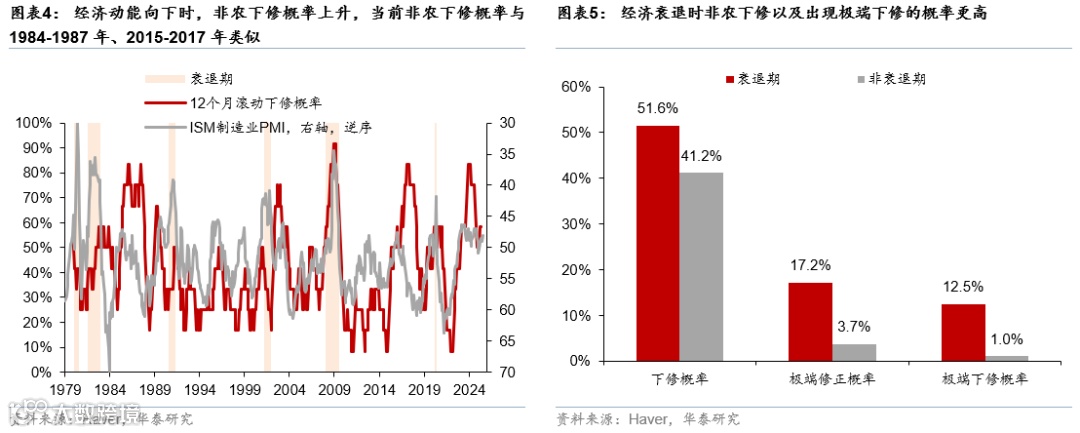 虽然经济衰退时期,非农下修的概率上升,但非农当前的下修概率仍然位于历史上合理区间。从历史复盘来看,经济放缓时,非农下修的概率更高;经济处于扩张周期时,非农上修的概率更高(图表4)。例如,经济衰退时期,非农下修的概率要超过非衰退时期,前者为52%,后者为41%(图表5)。2023年以来,非农下修的概率也整体上升,但从历史上看,非衰退时期出现非农下修概率大幅上升并不是特别异常,例如1984-1987年、2015-2017年均出现过非农下修概率明显上行的情况,但是经济并没有出现衰退。