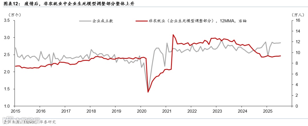 第四,非农调查的企业出生-死亡模型(Birth-Death Model)误差变大。由于企业调查只能覆盖样本内企业,新成立企业(births)和关闭企业(deaths)不能及时进入样本,会导致漏报,BLS通过企业出生-死亡模型(Birth-Death Model)推算“未在样本中的企业”对就业的贡献。Birth-Death Model基于历史规律,假设新企业和关闭企业的模式比较稳定,在经济衰退时,企业关闭增加,模型可能高估就业,而经济复苏初期,新企业增加,模型可能低估就业。疫情后,美国新成立企业数量结构性上升(图表11),显示企业出生以及关闭的历史关系可能发生变化,这将导致Birth-Death Model的误差变大。例如,亚特兰大联储的研究[4]显示在2023–2024年6月,Birth-Death Model导致就业水平累计高估约44万。