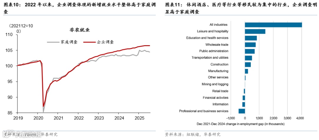 第二,2022年以来,移民大量流入提高了就业数据统计的难度。2022年以来,企业与家庭调查统计的就业规模出现明显差异(图表10)。由于家庭调查在统计就业规模时会根据人口规模进行推算,后者存在一定的调整时滞,导致在移民流入超预期的时期(2022-2024年),家庭调查明显低于企业调查。此外,非法移民群体也可能会顾及身份问题而在家庭调查中应答意愿下降,导致统计缺失。纽联储研究也佐证在移民就业较为集中的行业上,企业调查与家庭调查的差异更加明显[3]。