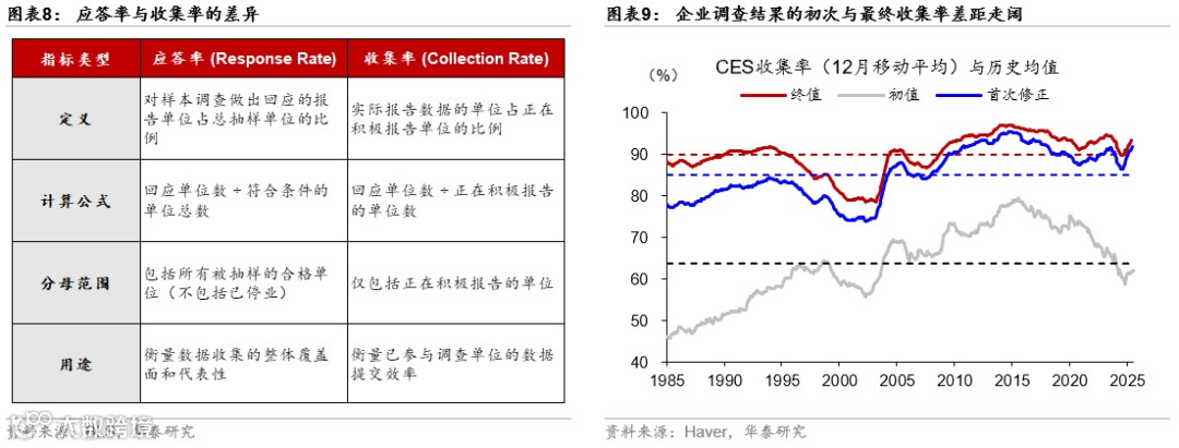 尽管非农数据波动变大,但非农仍然是美国经济较为及时的、全面的追踪指标。一方面,非农调查覆盖样本量大,即使样本应答率下降,但规模仍然较为可观。BLS每月向约12万家企业和政府机构采集数据,覆盖约63-67万个工作地点,代表约27%的美国非农就业岗位。虽然类似ADP等私人就业数据也有一定参考价值,但ADP只测算私人部门就业,不包括政府部门就业,加之ADP历史上曾多次调整统计方法(最近在2022年),其历史序列的可比性不足;另一方面,虽然企业调查的应答率延续回落,但收集率经补采后与疫情前水平接近。因此,虽然非农初值数据的噪音有可能上升,但通过观察后续修正值以及滚动均值,仍然对就业市场的趋势走向有较好的参考意义。