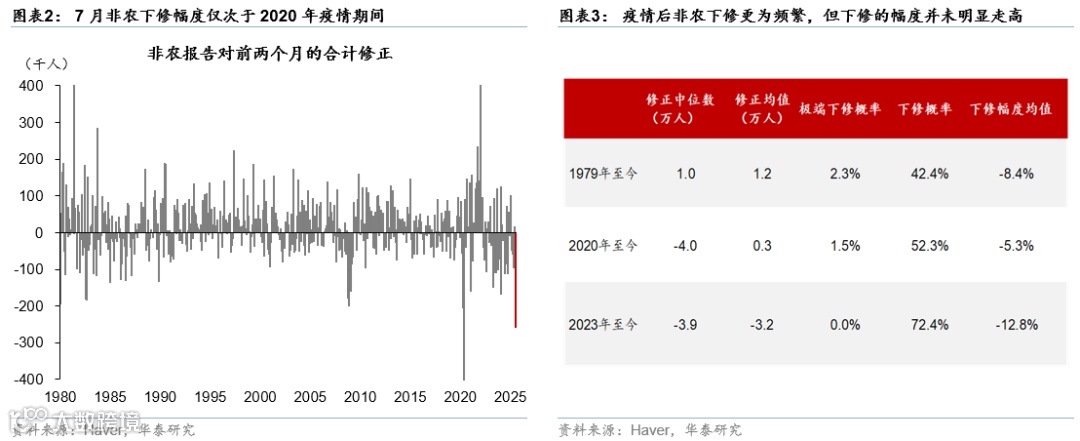 7月美国非农数据大幅修正,引发对美国就业数据的质疑以及美国经济衰退风险的担忧。每月公布非农报告包括来自企业调查的新增非农就业、小时工资等数据以及来自家庭调查的失业率、劳动参与率等数据。其中,新增非农就业数据由于样本量大(12万家以上企业,覆盖三分之一就业),公布时间较早,因此第一次公布的数据只是初值,此后两个月还会公布首次修正值以及终值。例如,8月初公布的7月初值、6月首次修正值与5月终值:7月新增非农就业为7.3万,同时,5-6月非农就业数据下修25.8万,为1980年代以来的第二大水平,仅次于2020年疫情期间(图表2)。7月非农报告以及此前非农数据的大幅修正导致部分投资者质疑非农数据的可靠性,特朗普甚至以此为由解雇美国劳工统计局(BLS)局长麦肯塔弗。