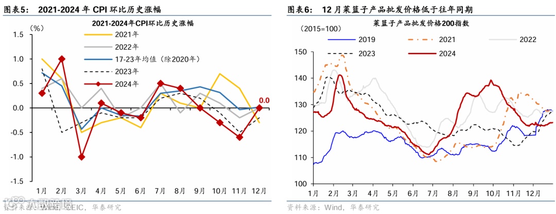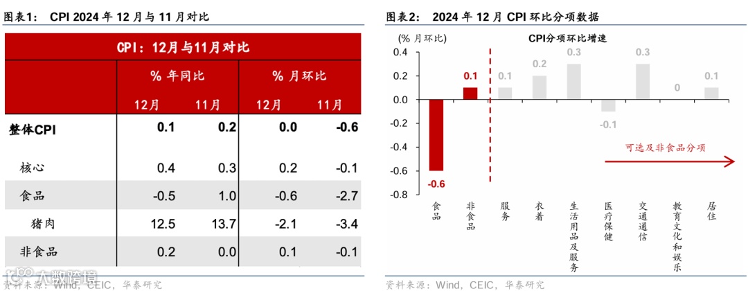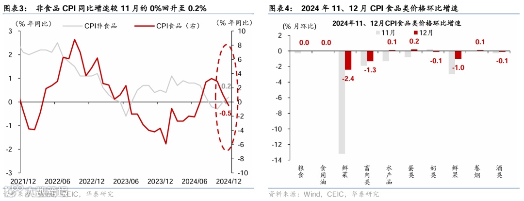 综合而言:12月CPI同比回落至0.1%,仍主要受到食品价格走弱的拖累,部分由于暖冬气候推升食品供给,非食品价格在低基数下同比略有回升;核心CPI延续弱回升。食品价格同比从11月的1%回落至-0.5%,合计拖累CPI同比0.09个百分点;而核心CPI同比从11月的0.3%略回升至0.4%,环比亦略高于季节性水平,或反映内需延续温和回暖的态势。同时,消费品CPI同比从11月的0%回落至-0.2%、或显示“以旧换新”对价格的影响。12月PPI同比降幅有所收窄,行业层面延续分化格局,油气等行业价格降幅收窄,但下游汽车等行业的价格拖累有所走阔。全年来看,CPI涨幅基本持平于2023年的0.2%,而 PPI同比降幅较2023年全年收窄0.8个百分点至2.2%。