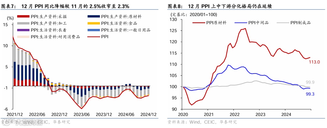 同比而言,12月PPI同比回升主要受益于油气等上游生产资料价格降幅收窄,耐用消费品对价格持续形成拖累——生产资料价格同比降幅较11月的2.9%收窄至2.6%,生活资料价格同比降幅持平于11月的1.4%。其中,由于国际原油价格中枢仍偏低,上游行业中油气开采/油煤加工同比分别回落6.2%/8.7%,黑色金属采选/加工同比降幅较11月的9.1%/8.2%走阔至11.4%/9.5%;煤炭开采同比增速较11月的-6.3%下探至-8%;但有色金属采选/冶炼加工同比从11月的18.5%/9.7%回升至19.1%/10%。中游行业同比变动相对平稳,通用设备同比降幅较11月的1.1%小幅收窄至1%,运输设备同比增速较11月的0.2%放缓至0.1%;下游行业价格指标边际回暖,电子设备、医药同比降幅分别较11月的2.5%/0.9%收窄至1.9%/0.5%。生活资料中,耐用消费品12月同比回落3.1%,对PPI拖累约0.2个百分点,或体现出“以旧换新”补贴活动对家电、汽车等带来的“量增价跌”效果。