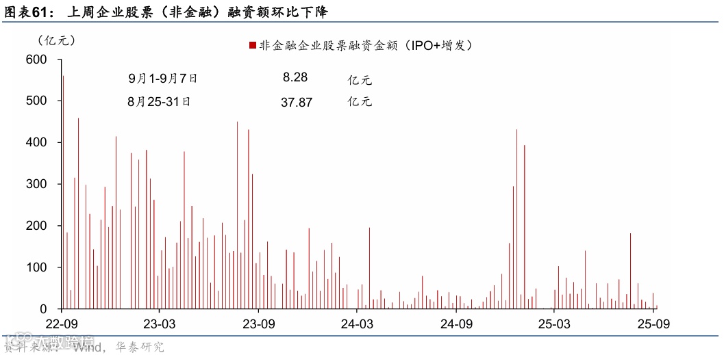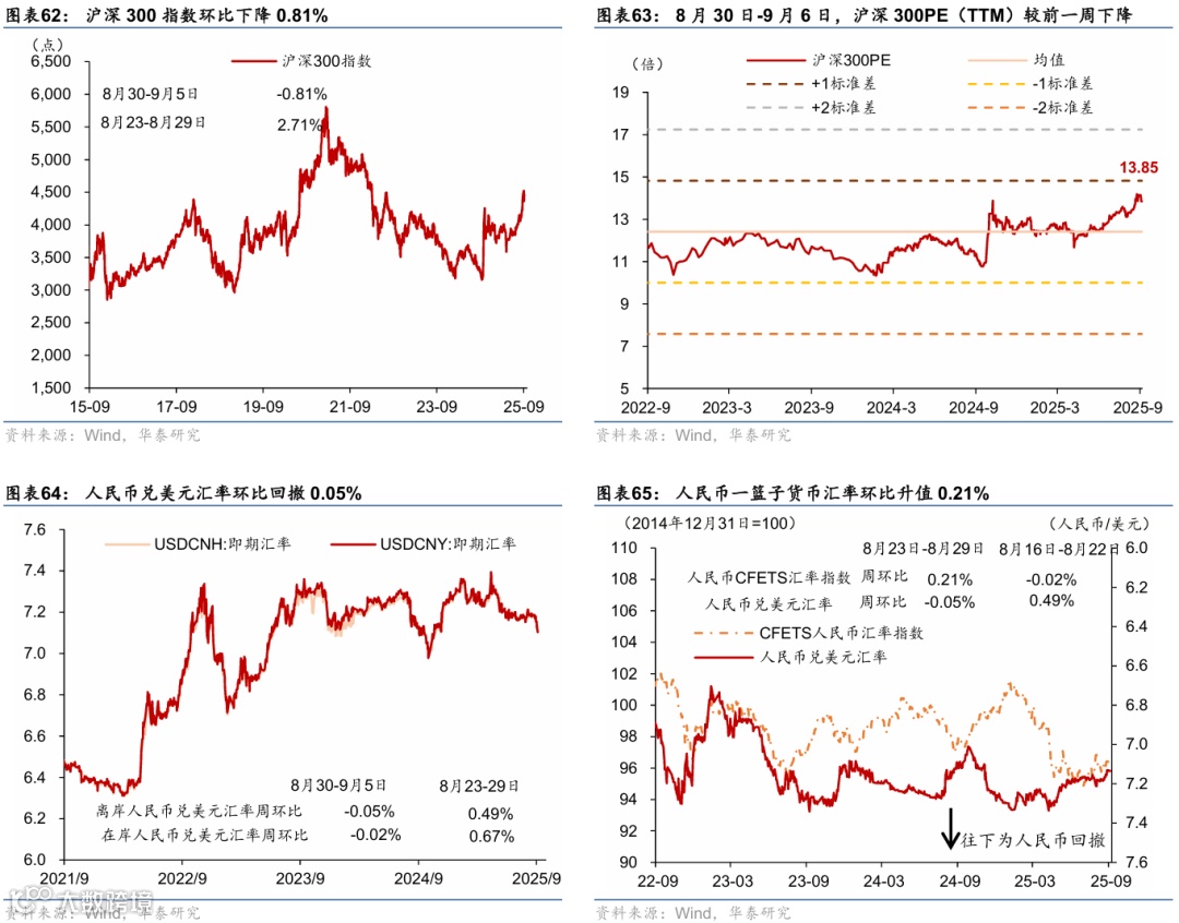融资及汇率:1年期AA级和AAA级企业债收益率均下降,1年期AA-AAA级和3年期AA-AAA级企业债信用利差均收窄。上周房地产债发行金额环比上升,股权融资额环比下降。指数表现方面,沪深300指数周环比下降0.81%,PE(TTM)估值水平较前一周边际下行。汇率方面,截至9月5日,人民币兑美元汇率较前一周回撤0.05%,对一篮子货币汇率环比升值0.21%。上周利率债总发行5,630亿元,国债净发行量同比多增69亿元,地方政府债净发行量同比多增627亿元,利率债净发行量总额同比增加10.6%。