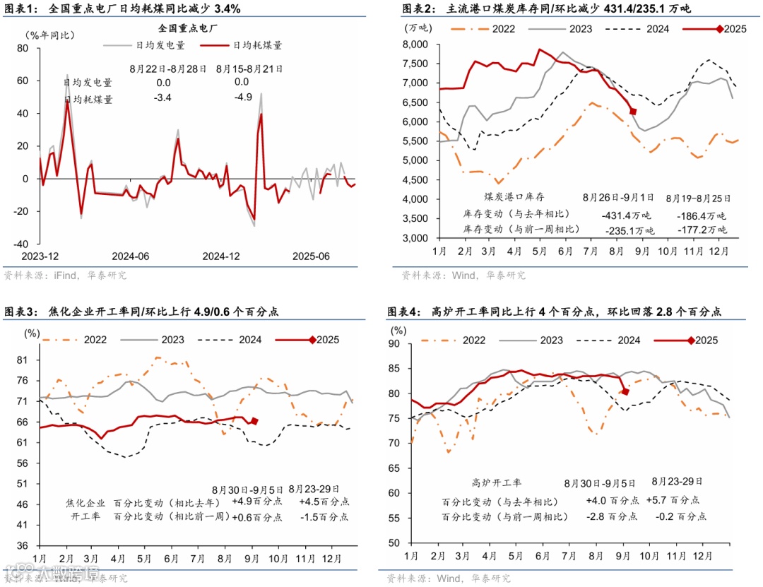 上游:8月22-28日,全国重点电厂耗煤量同比降幅收窄;8月26-9月1日煤炭持续去库;高炉、焦化开工率均高于去年同期。8月22-28日,全国重点电厂日均耗煤量同比降幅较前一周的4.9%收窄至3.4%。8月26-9月1日,主流港口煤炭库存环比减少235.1万吨,同比减少431.4万吨。8月30日-9月5日,焦化企业开工率同比上升4.9个百分点,环比较前一周回升0.6个百分点;高炉开工率同比增加4.0个百分点,环比下降2.8个百分点。