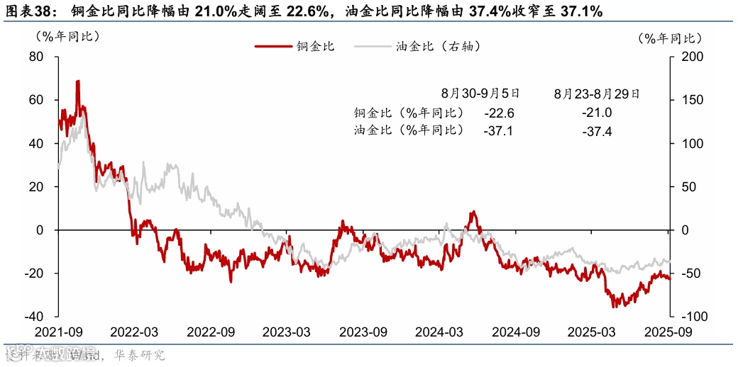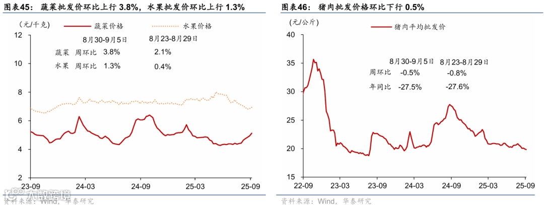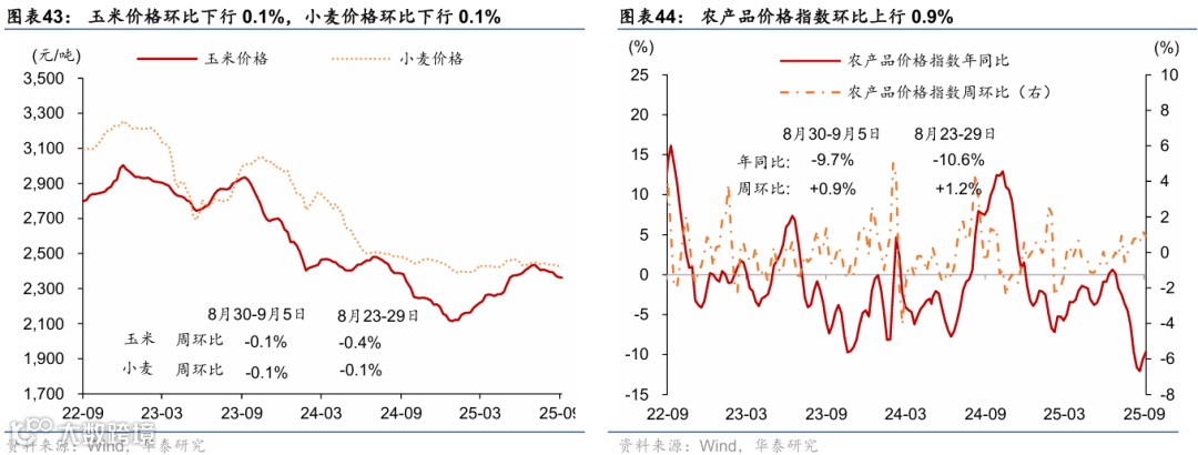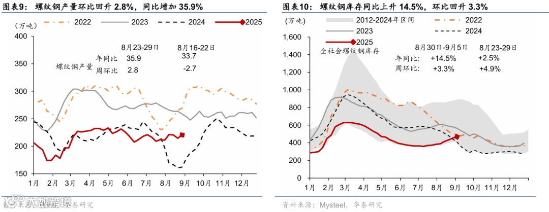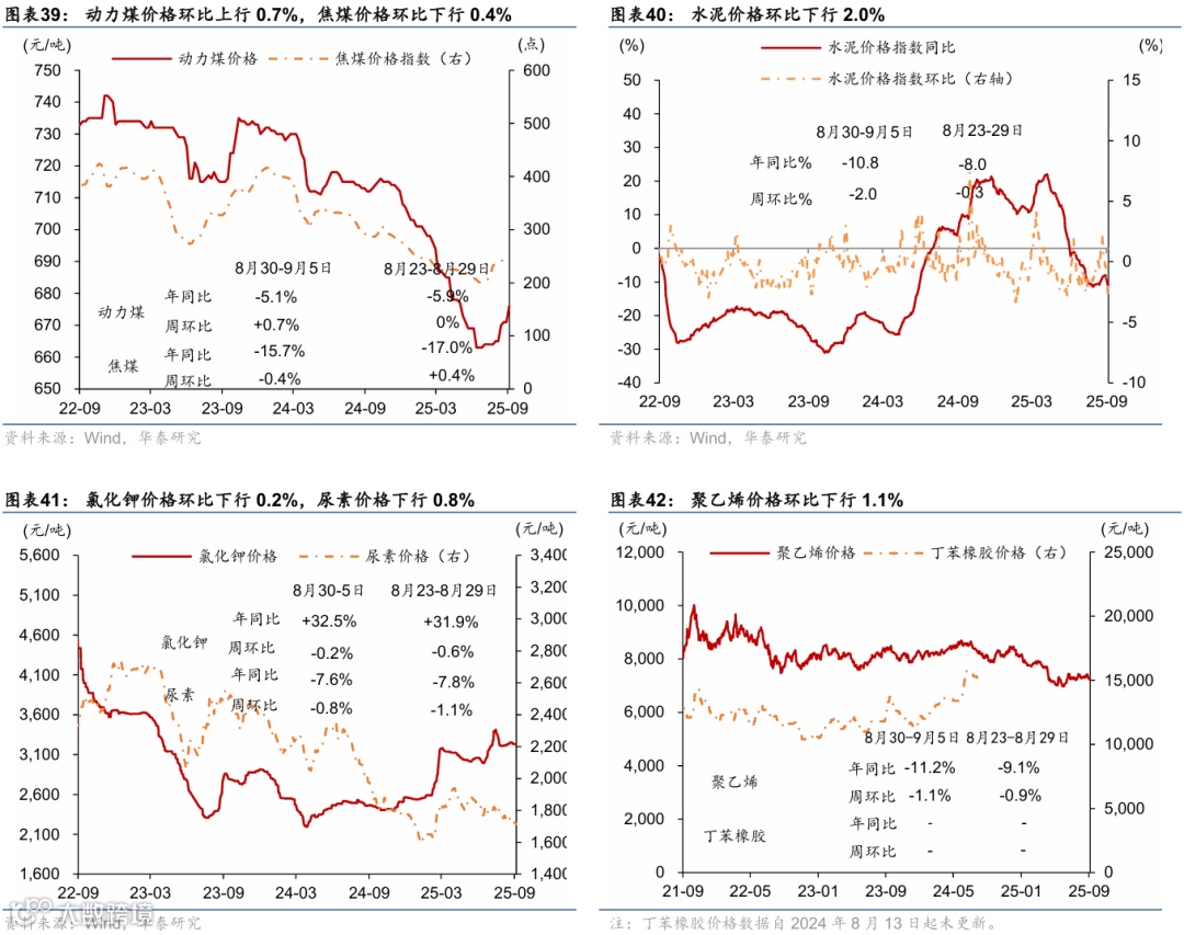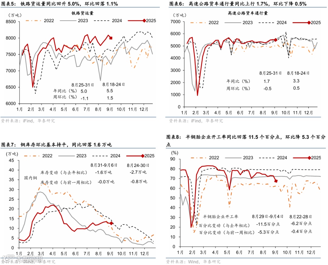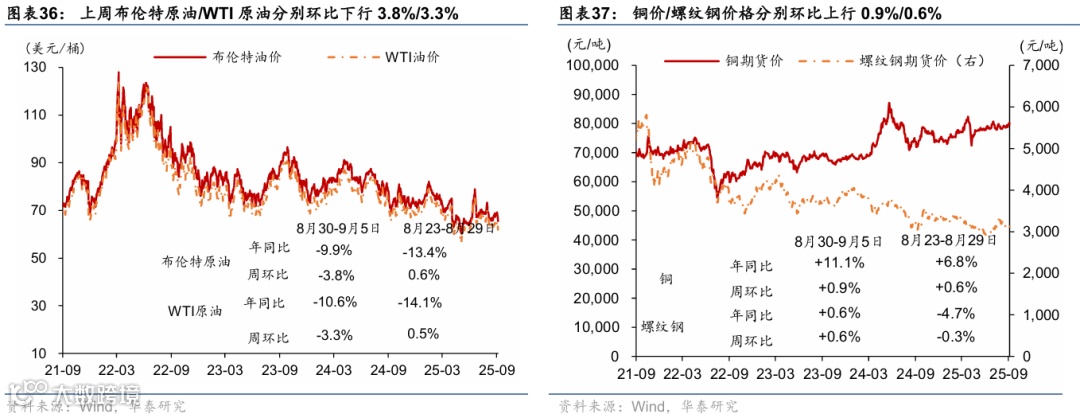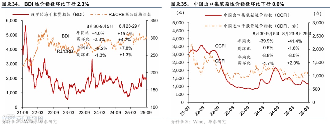 下游:国内建筑开工需求局部改善但整体仍承压,水泥开工率同比下降、环比转正,建筑钢材成交量同比降幅走阔。8月29-9月4日,水泥企业开工率同比下降6.9个百分点,环比回升至1.2个百分点。8月30日-9月5日,建筑钢材日均成交量同比降幅由前一周的4.4%走阔至22.1%,环比转正至2.7%。此外,8月29-9月4日,反内卷政策影响下半钢胎开工率同比下降11.5个百分点,环比降幅走阔至5.3个百分点;8月30日-9月5日,螺纹钢库存同比增长14.5%,环比增速3.3%。