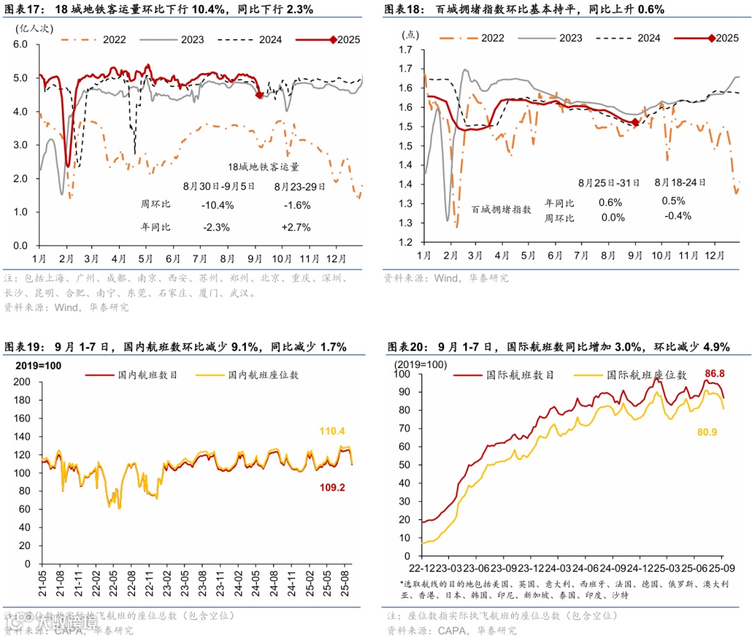 线下消费:乘用车零售同/环比增长,电影票房同比增长。8月25-31日乘用车销量同比增加2.1%,环比增加59%;8月全月乘用车销量同比增长3%,环比增长7%;前8个月累计同比增长9%。8月30日-9月5日,全国电影票房同比较前一周的27.3%放缓至21.1%,但总体表现维持活跃。