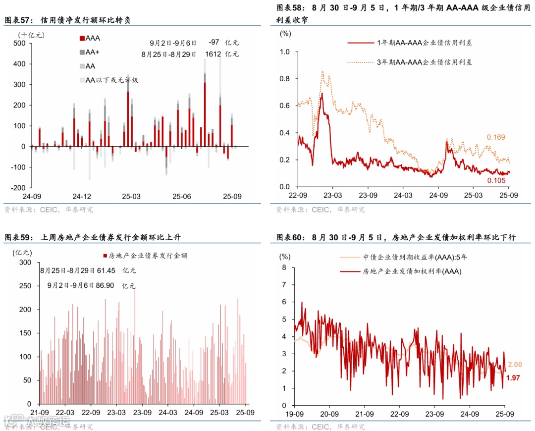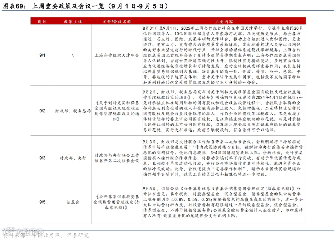 1)9月3日,财政部与央行联合工作组第二次组长会议明确将“持续推动债券市场平稳健康发展”作为政策协同核心目标。2)9月5日,证监会就《公开募集证券投资基金销售费用管理规定(征求意见稿)》公开征求意见,拟调降公募基金认购费、申购费和销售服务费率水平。3)9月5日,深圳进一步放松住房限购政策,符合条件的居民家庭在部分区域购房不限套数,房贷利率不再区分首套和二套住房。