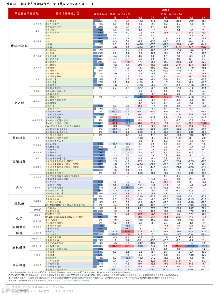 绝对水平:有色金属、航运港口和社会服务等行业景气度相对较高;国际有色金属价格月环比止跌回升,光伏产业链价格亦整体上行,而半导体产业链价格略有回撤;从各行业供给、需求/价格所在历史序列的百分位值来看(2013年至今,下同):