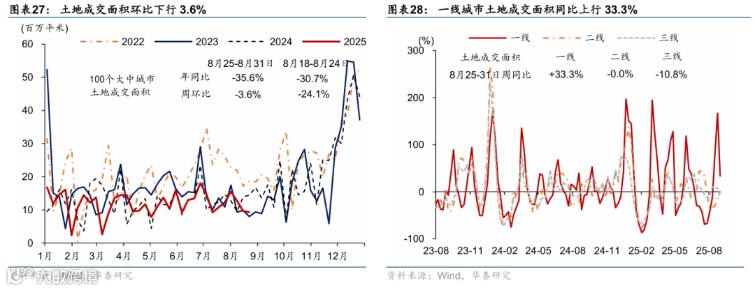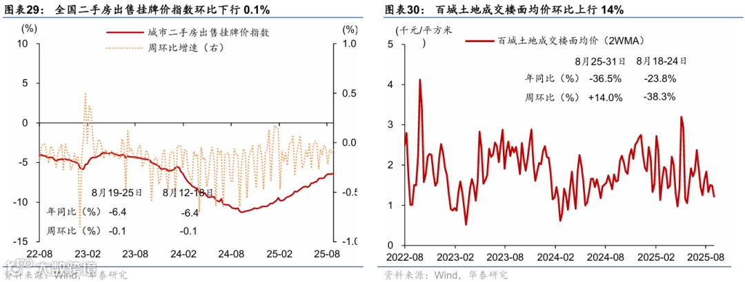 地产需求:上周新房成交面积同比降幅从前一周的6.5%走阔至15.5%,二手房成交面积同比由前一周的6.8%放缓至5.7%,其中一线城市新房成交面积降幅从前一周的14%收窄至6.6%,而二手房成交面积同比从前一周的8.5%放缓到6.6%。价格方面,8月25日-8月31日,百城土地成交楼面均价环比上行14%。