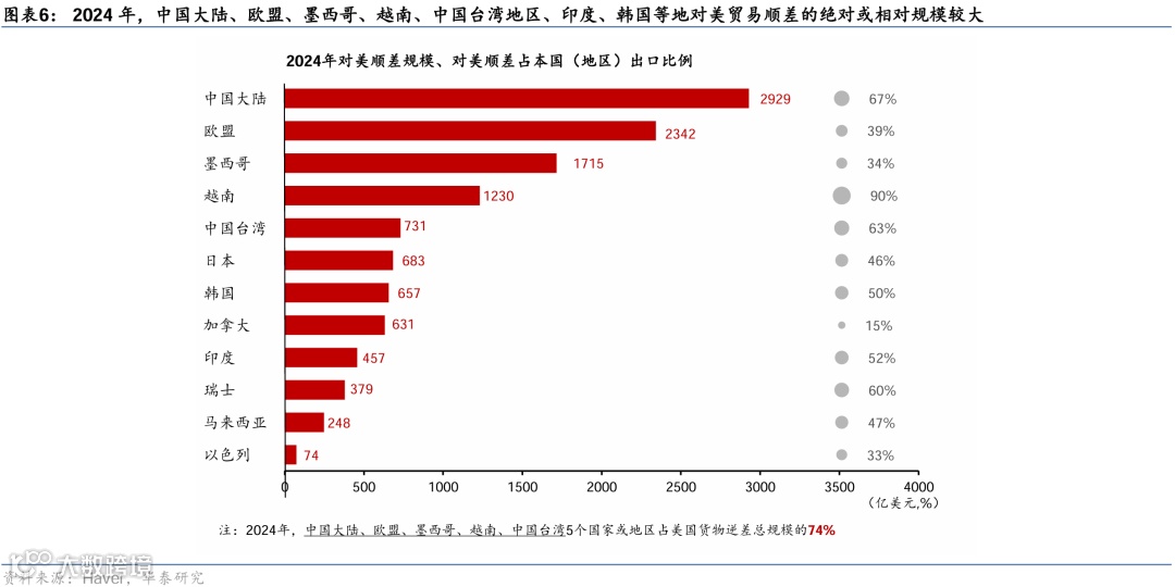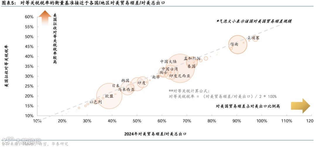 在10%最低税率和战略商品关税的基础上,美国可能对一些地区保留更高的税率,如对美贸易顺差较大的国家和地区。美国对不平等税率的衡量基准接近于各国对美国贸易顺差/对美国总出口,显示特朗普对贸易公平的评判标准主要是贸易差额,预计美国可能会维持部分对其顺差较大的国家/地区的对等关税(图表5)。结合考虑各国与美国制造业的潜在竞争、在对等关税谈判中的态度、以及特朗普近期表态等各方面因素,预计美国可能会对顺差较大的国家/地区保留更高的税率(图表6)。