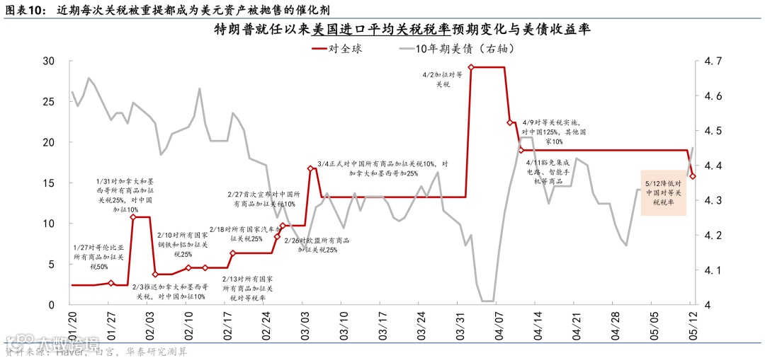 其中,对墨加关税仍有调整空间。由此,关税政策可能推高美国核心通胀约1.5-2.1个百分点,压低美国增长约1.1-1.8个百分点(参见《量化高关税对美国经济的冲击》,2025/4/7)。此外,近期美国较为“随机”关税政策和资本加速流出美国+美元资产(尤其美债)风险溢价上升间的“负反馈”变得更剧烈、更“即时”。特朗普以超高关税作为谈判杠杆的制约也将越来越强。