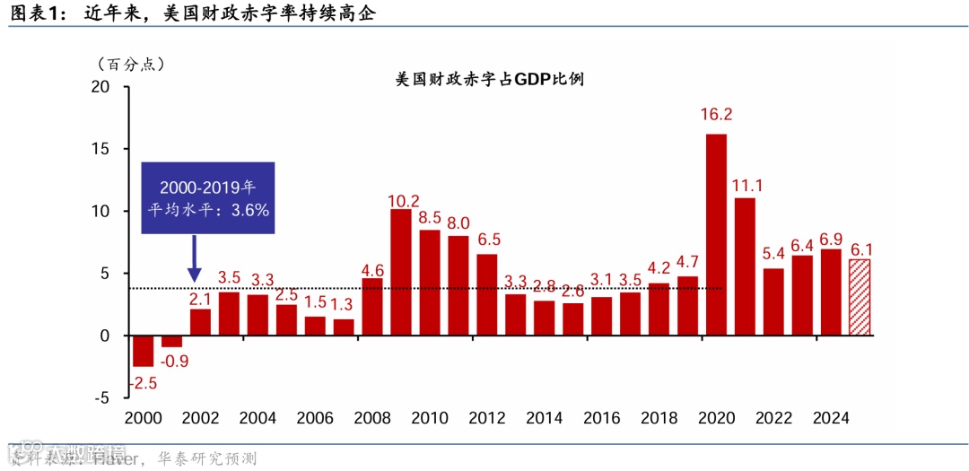 特朗普加征关税的底层逻辑是“美国优先”,即试图通过关税政策来实现缩减贸易逆差、推动制造业回流、以及补充财政收入的多个政策目标。在就职演说中,特朗普将“让美国再次伟大”作为自身使命,明确表示要让经济发展惠及美国中低收入阶层、增加其购买力,增强美国包括能源、汽车工业在内的基础产业竞争力(参见《特朗普就职后的变与不变》,2025/1/21)。在4月初推出对等关税时,特朗普对各国不平等税率判定的基准更接近该国对美国贸易顺差/对美国总出口,显示特朗普关税的出发点是缩减贸易逆差(参见《特朗普提出百年未见高关税》,2025/4/3)。近日特朗普要求苹果公司在本土生产手机,否则可能面临至少25%的关税,反映其推动制造业回流的诉求。5月22日,美国众议院通过了“美丽大法案”,其核心是减税,预计将在未来10年合计增加赤字约3.8万亿美元(参加《众议院的“美丽大法案”和日益恶化的美债前景》,2025/5/24)。美国对内减税亟需补充财政收入,否则将面临赤字扩大、引发财政可持续性担忧的困境(图表1)。而与对单一国家大幅加征关税相比,全球征税的“效率”更高,对供应链扰动更小,且增厚财政收入的效果可能更好。具体看,
