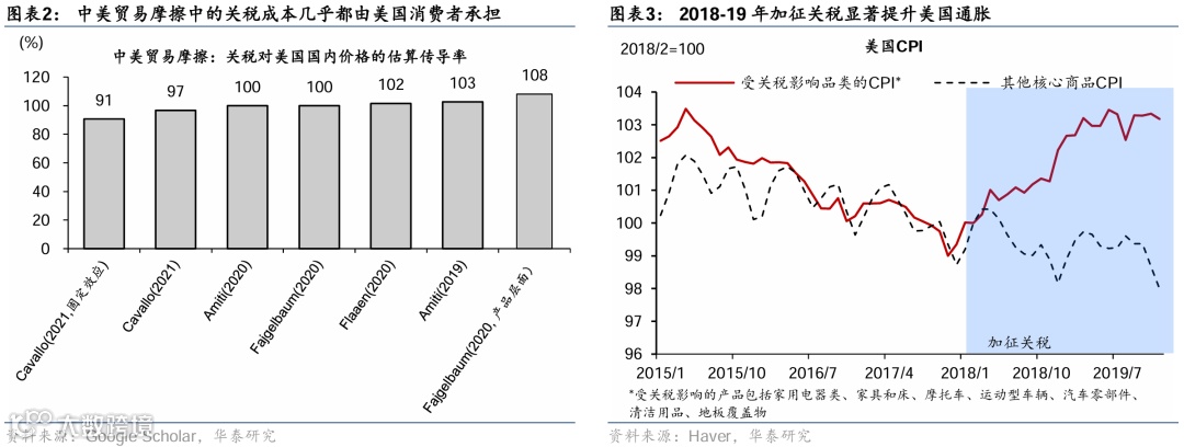 全球征税比对单一国家大幅加征关税的“效率”更高,对供应链扰动更小。如果要达到同样“增厚财政收入”的效果,对全球加征关税可能是对贸易链的扰动更小、效率损失和通胀影响更为温和的做法。而鉴于制造业大国部分定价了美国消费品的边际价格,对这些国家大幅提高关税或将导致部分依赖进口的品类出现供给不足,在短期内显著推高美国通胀。2018-2019年中美贸易冲突的经验显示,关税对美国国内价格的传导率几乎为100%(图表2)。受关税影响的消费品价格显著抬升,2019年底加征关税的消费品CPI相对未受关税影响的消费品高出了5%(图表3)。