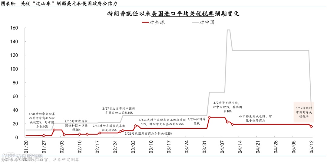 a) 假设美国最终对华累计加征的关税与当前相近,或将推高美国对全球加权税率3.2-5.4个百分点。虽然中美“限制性”关税已降级,但美国针对中国24%的对等关税及与芬太尼相关的20%关税悬而未决(参见《美中关税降级的缘起、影响和后续》,2025/5/13)。考虑中美可能维持战略竞争格局,美国对华关税水平短期或将高于全球“基准”(最低)水平,但其中对等关税和芬太尼相关关税的最终税率、即关税“结构”可能有调整空间。