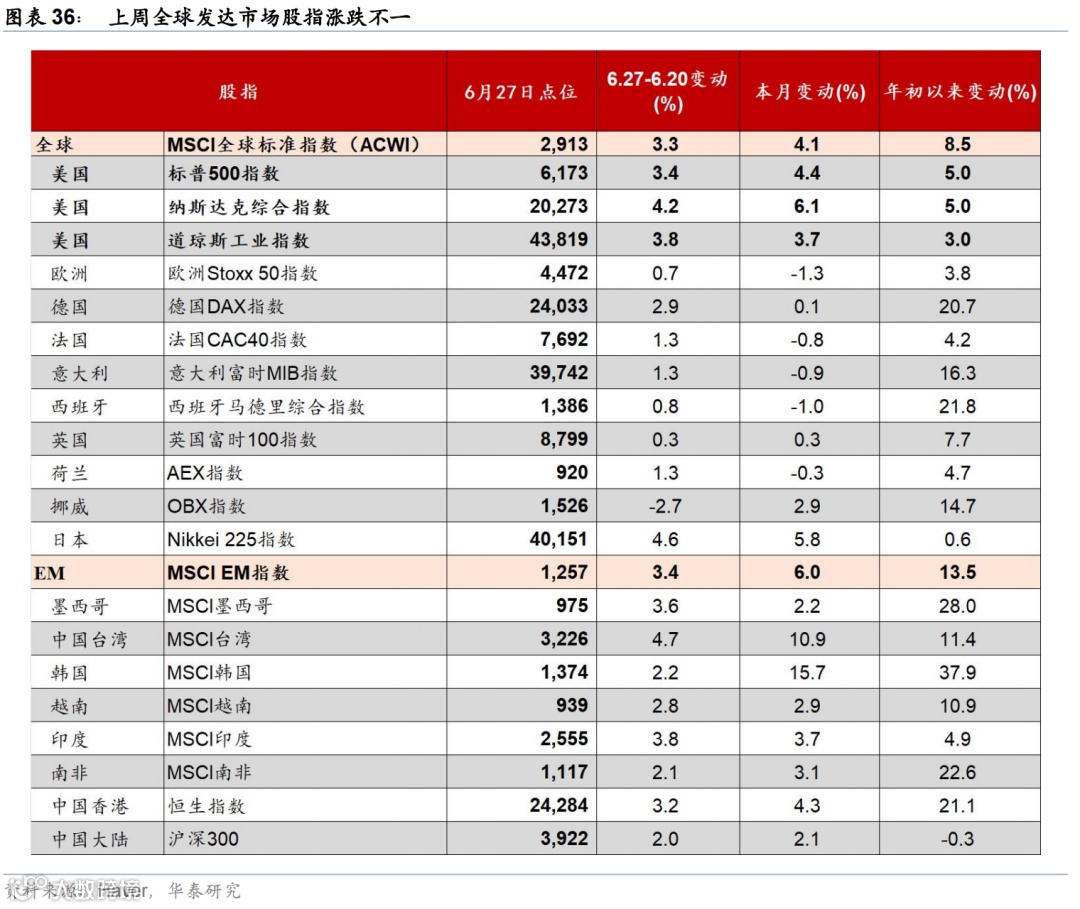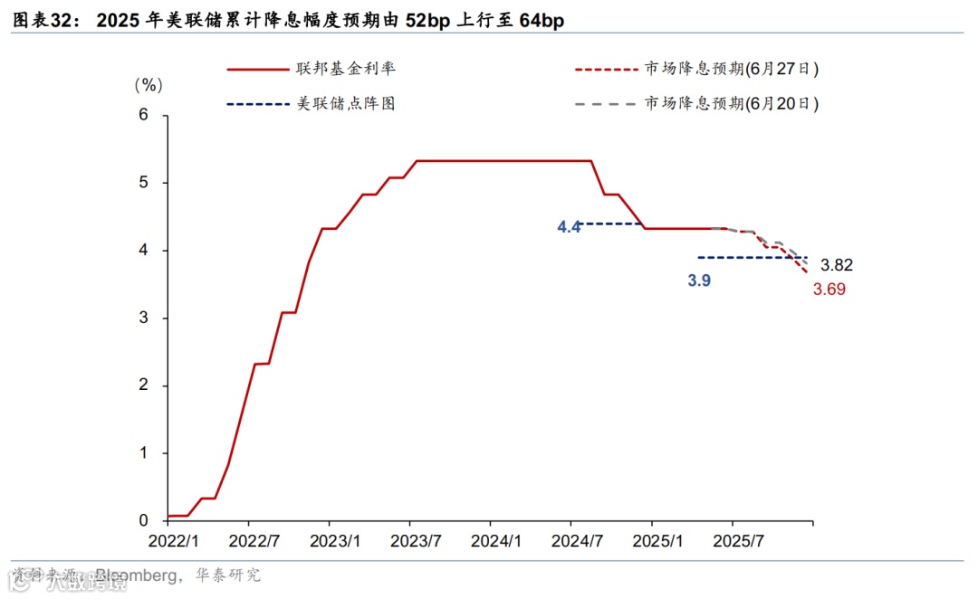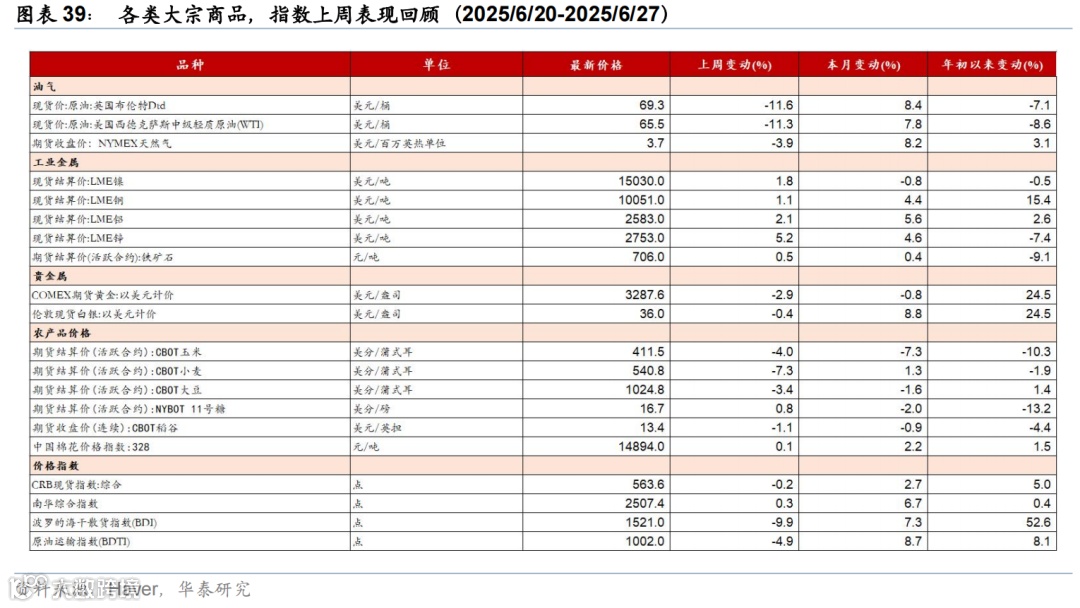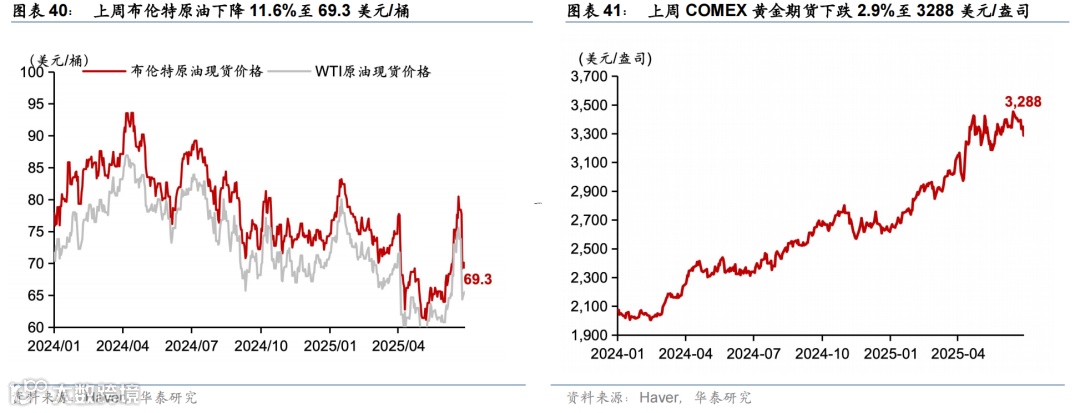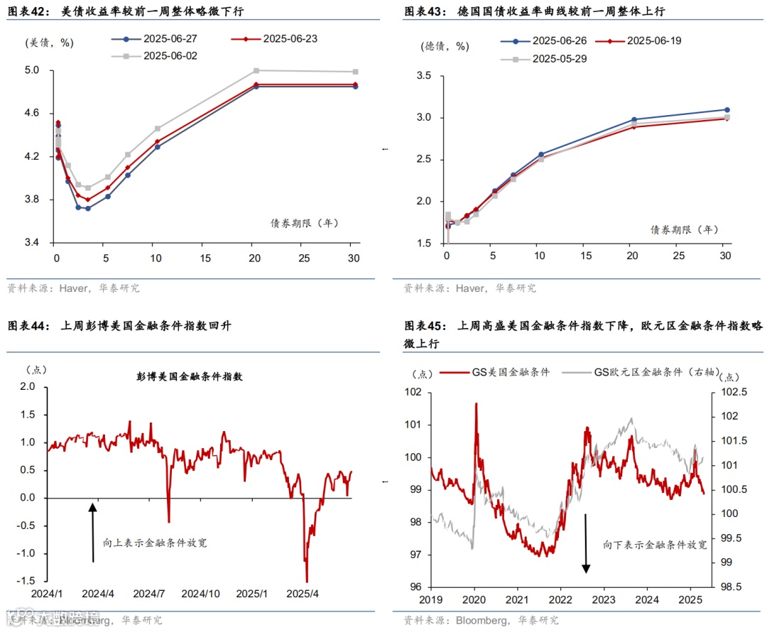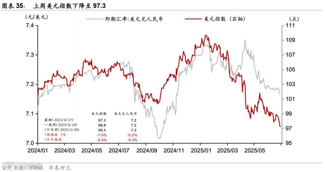 上周联储降息预期回升,美债收益率下行,美元走弱,美股走强,大宗商品表现分化。市场对联储2025年降息预期由52bp升至64bp,美债收益率明显回落,2年期与10年期收益率分别下行17bp和9bp至3.7%、4.29%。标普500、纳指和道指分别上涨3.4%、4.2%、3.8%。汇率方面,美元指数下跌1.5%至97.3,欧元升值1.6%至1.17,日元升值0.6%至144.5。大宗商品方面,COMEX黄金期货下跌2.9%至3287.6美元/盎司;以伊停火,中东地缘政治风险下降,布伦特原油回落11.6%至69.3美元/桶,LME铝上涨2.1%至2583美元/吨。