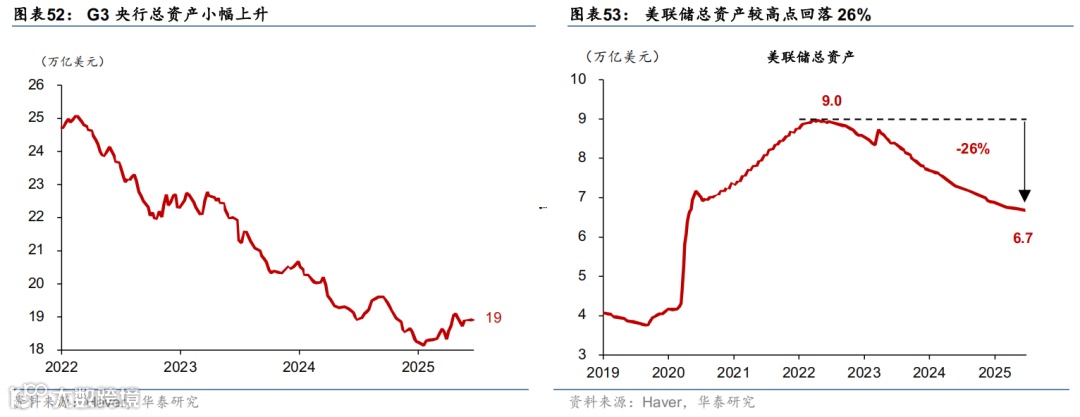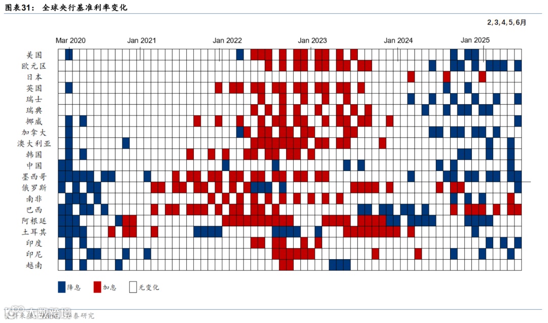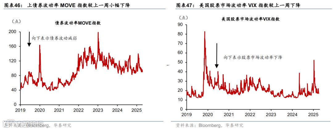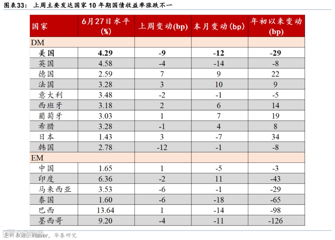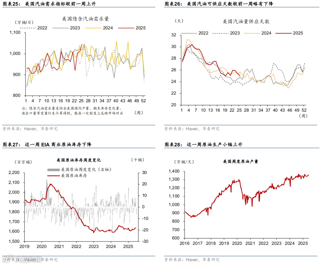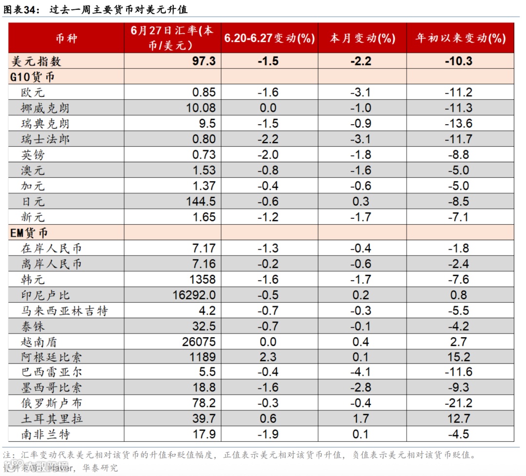上周联储降息预期回升,美债收益率下行,美元走弱,美股走强,大宗商品表现分化。市场对联储2025年降息预期由52bp升至64bp,美债收益率明显回落,2年期与10年期收益率分别下行17bp和9bp至3.7%、4.29%。标普500、纳指和道指分别上涨3.4%、4.2%、3.8%。汇率方面,美元指数下跌1.5%至97.3,欧元升值1.6%至1.17,日元升值0.6%至144.5。大宗商品方面,COMEX黄金期货下跌2.9%至3287.6美元/盎司;以伊停火,中东地缘政治风险下降,布伦特原油回落11.6%至69.3美元/桶,LME铝上涨2.1%至2583美元/吨。