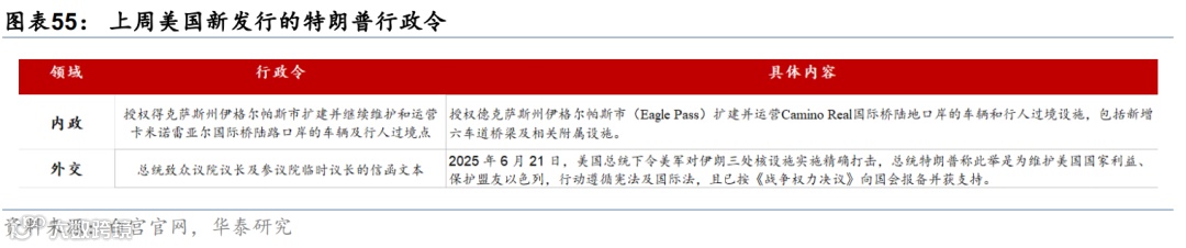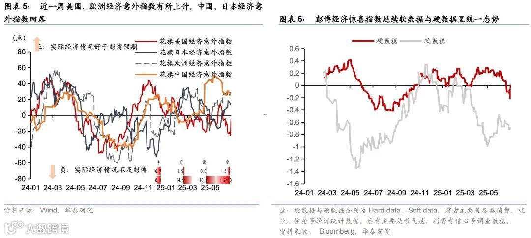 美国软数据和硬数据的分化进一步收窄:5月居民消费放缓,而6月PMI整体超预期。美联储等三大监管机构通过下调eSLR提案,放松对系统重要性银行的监管;参议院版本“大而美”法案削减开支部分条款受阻,扩张力度或超众议院版本。硬数据放缓推升联储降息预期,美债利率下行,美元走弱,美股走强;中东地缘政治风险下降推动油价大幅回落。本周关注美国6月ISM制造业PMI(7月1日)、美国6月非农(7月3日)。