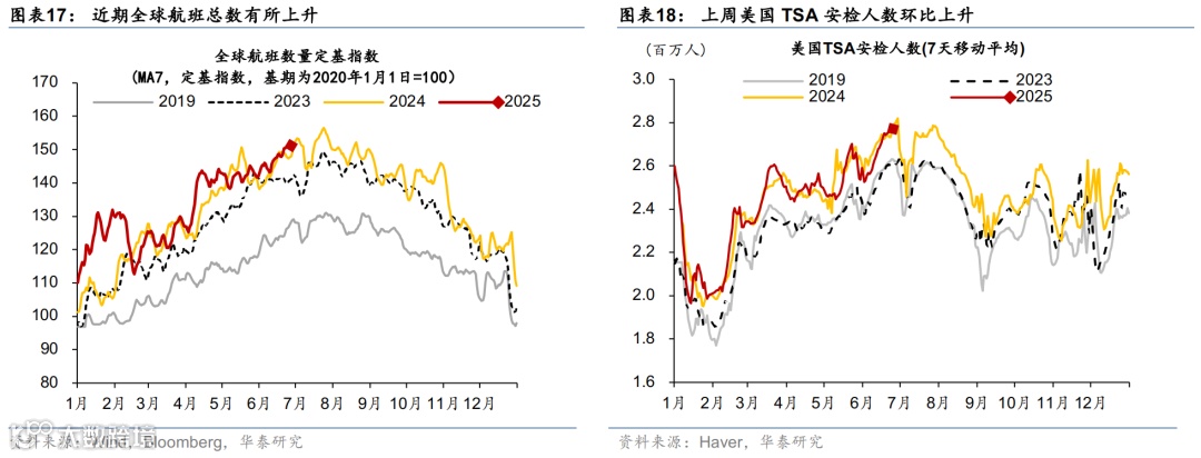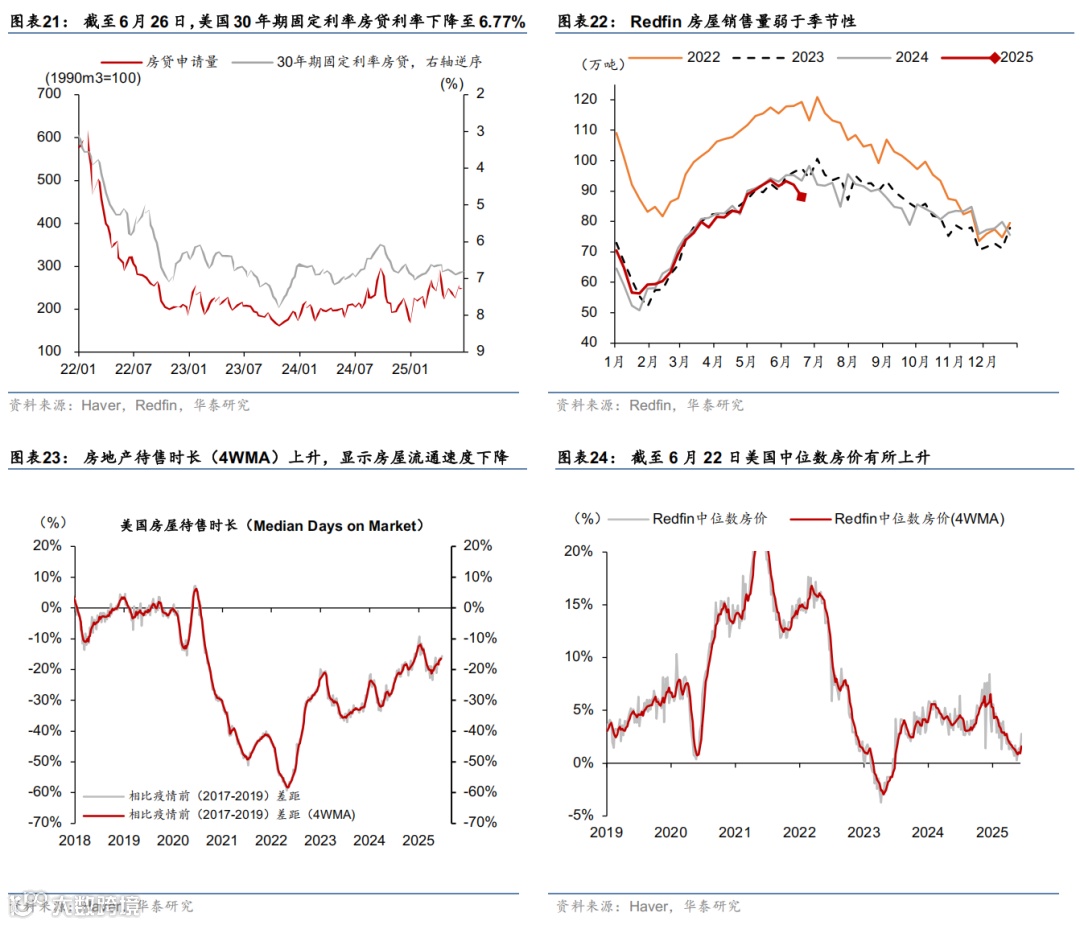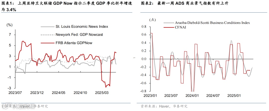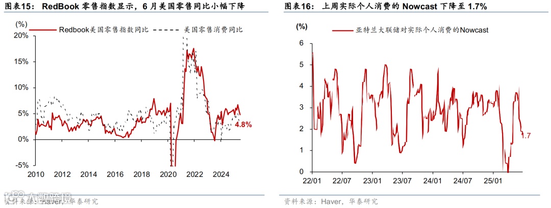高频数据显示美国消费放缓,劳动力市场维持韧性,住房需求仍偏弱。增长方面,亚特兰大联储GDP Now指示美国二季度实际GDP增速2.9%。消费方面,上周实际个人消费Nowcast 降至1.7%,红皮书周度零售同比延续放缓。就业市场方面,首申人数降至23.6万人,低于预期(彭博一致预期,下同);续申人数降至197.4万人,超预期升至近三年来最高。地产方面,30年期固定利率房贷利率小幅降至6.77%,Redfin房屋销售仍弱于季节性。