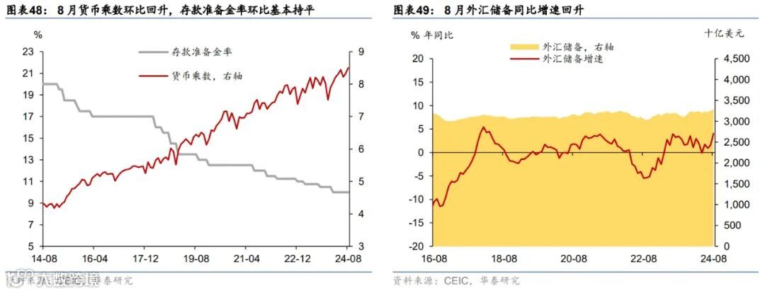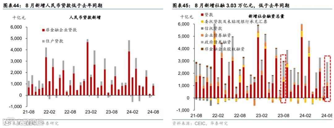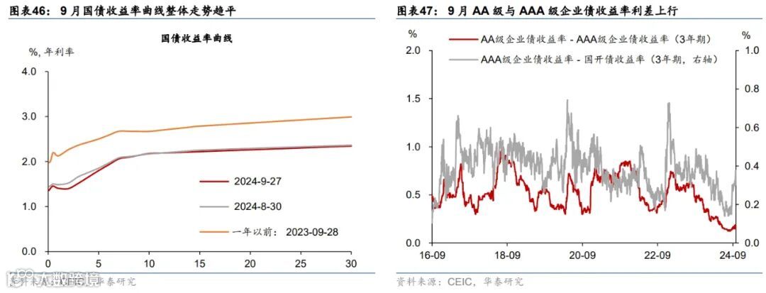 金融市场:9月LPR未调降,但9月24日央行宣布降准降息并引导贷款市场报价利率和存款利率同步下行;MLF缩量降价续作3,000亿元、中标利率2.3%;9月利率债净发行同比大幅多增。截至9月27日,1/10年期国债收益率较8月末分别下行6bp、上行0.4bp;银行间流动性偏松,R007/DR007月环比上行10bp、下行12bp。9月国债、地方债和政策性银行债合计净发行约1.6万亿元,同比多增5,397亿元。汇率方面,截至9月27日,人民币兑美元汇率回升1.03%、兑一篮子货币回升0.58%。