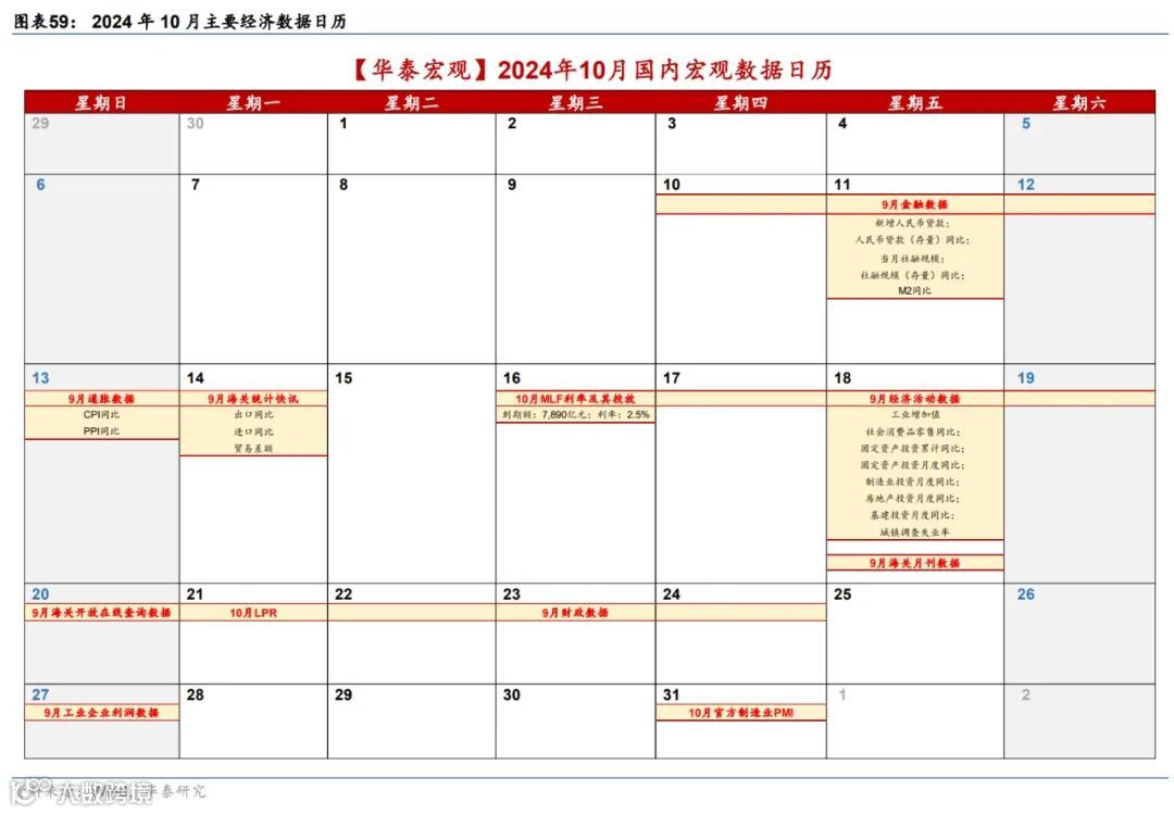 1)关注10月逆周期调节政策的实施和部署,在政治局会议指出发行使用好长期特别国债和地方专项债后、10月人大常委会是否有关上调赤字或者增发特别国债决议。
