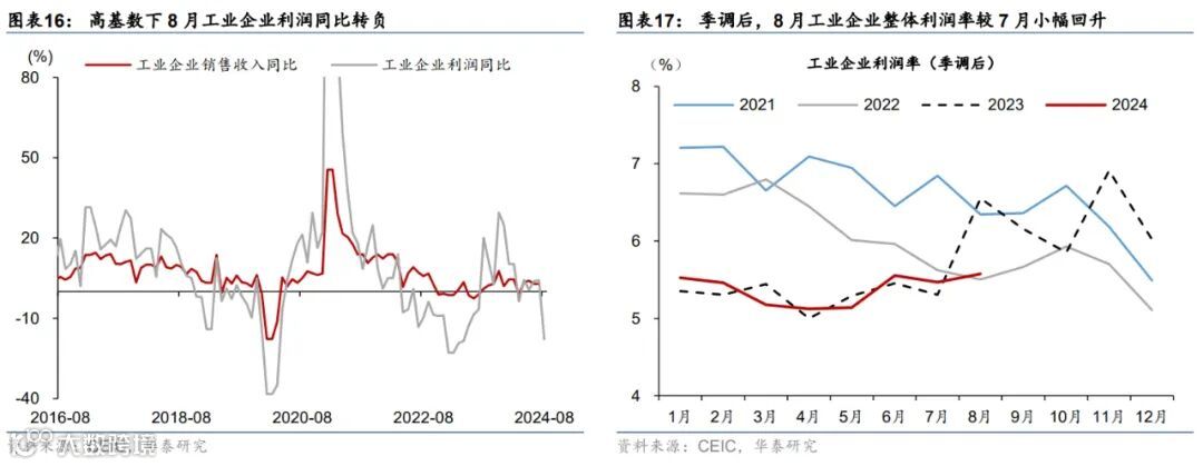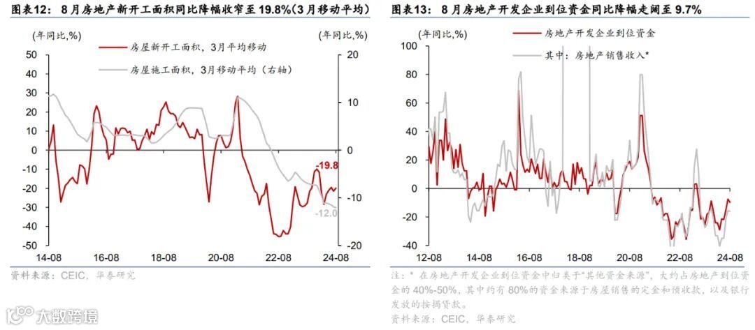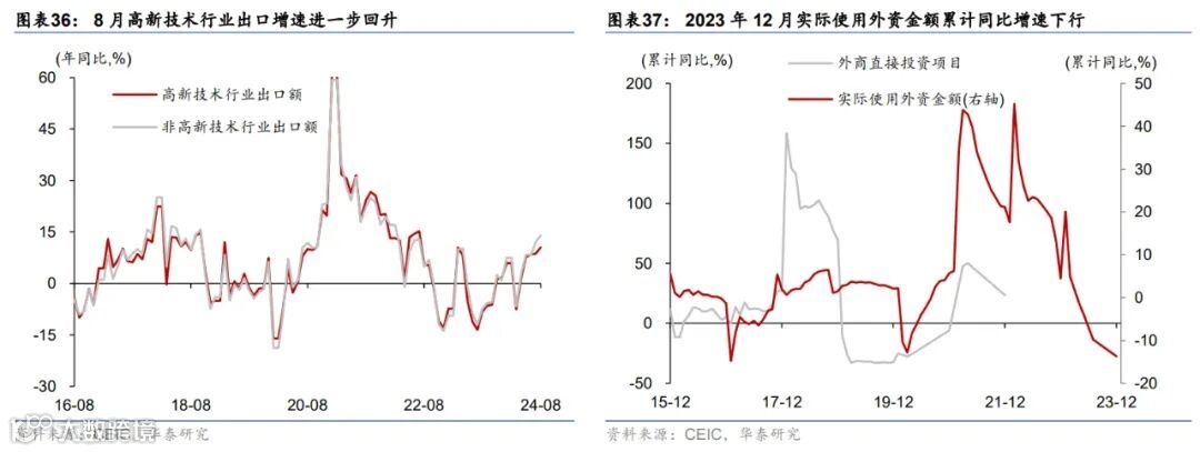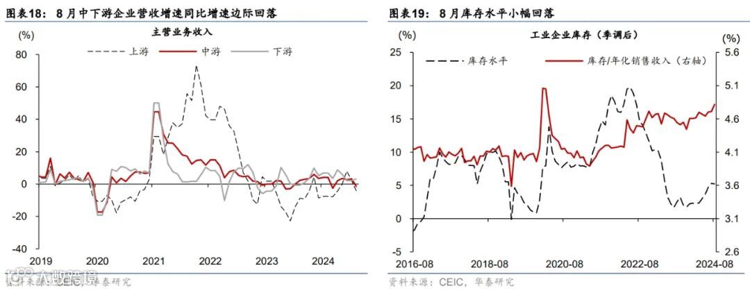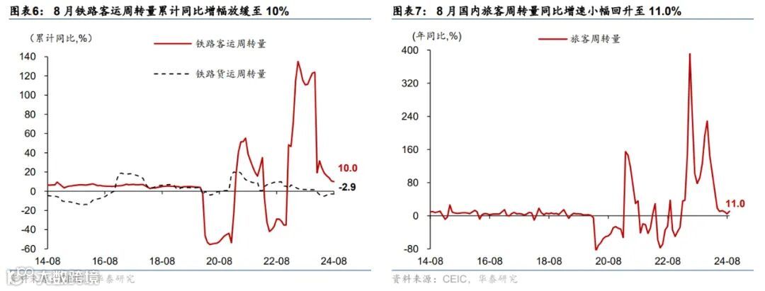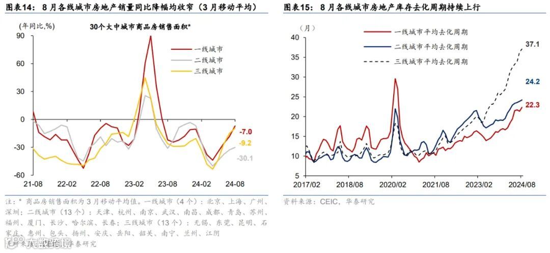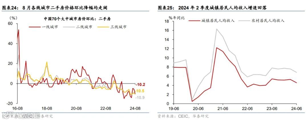 高频数据显示9月居民市内交通出行同比偏低,汽车销售有所改善,出口增长环比边际减速、生产和投资活动仍偏弱,商品房成交同比回落。出行方面,截至9月29日,18城地铁客运量同比回落3.1%、国内航班数量亦低于去年同期4.6%。汽车销售有所改善,9月1-22日,乘用车日均零售销量同比增速较8月的-1%转正至10%。物流增速同比偏低,截至9月29日,整车货运物流/公共物流园区吞吐指数同比回落3%/6%;出口高频指标HDET显示9月出口环比转负,同比较8月有所减速。基建和建筑活动开工同比仍偏弱,高炉/焦化/水泥开工率月均同比回落6.3/9.6/5.6ppt,建筑钢材成交量同比回落19.6%。商品房成交同比减速,9月1-29日,60城新房/26城二手房成交面积同比较8月的-21.7%/6.8%回落至-32.8%/-9.7%,一/二/三线城市二手房成交同比较8月的5.5%/13.3%/4.6%回落至4.9%/11.9%/4.0%。