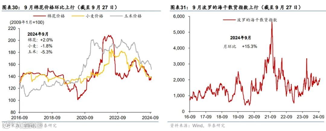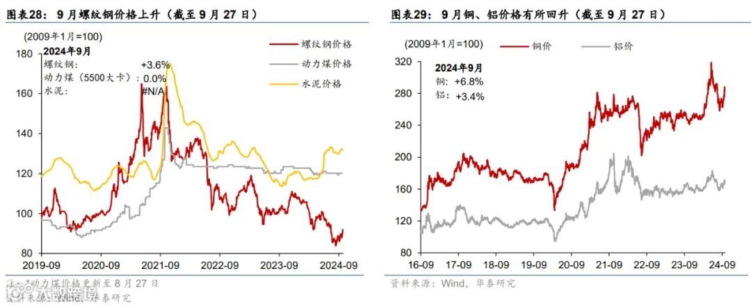 通胀:国际原油价格回落、金价续创新高,国内原材料价格整体回升。截至9月27日,布伦特油价全月累计环比回撤9%至72美元/桶,而COMEX黄金月环比走高6%;国内原材料价格方面,铜/铝/螺纹钢9月累计环比回升6.8%/3.4%/3.6%。农产品方面,蔬菜/棉花价格全月环比回升7%/2%,而猪肉/玉米/小麦价格月环比回落5%/5.3%/1.8%。