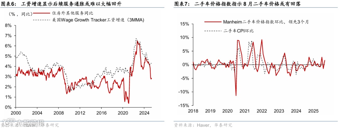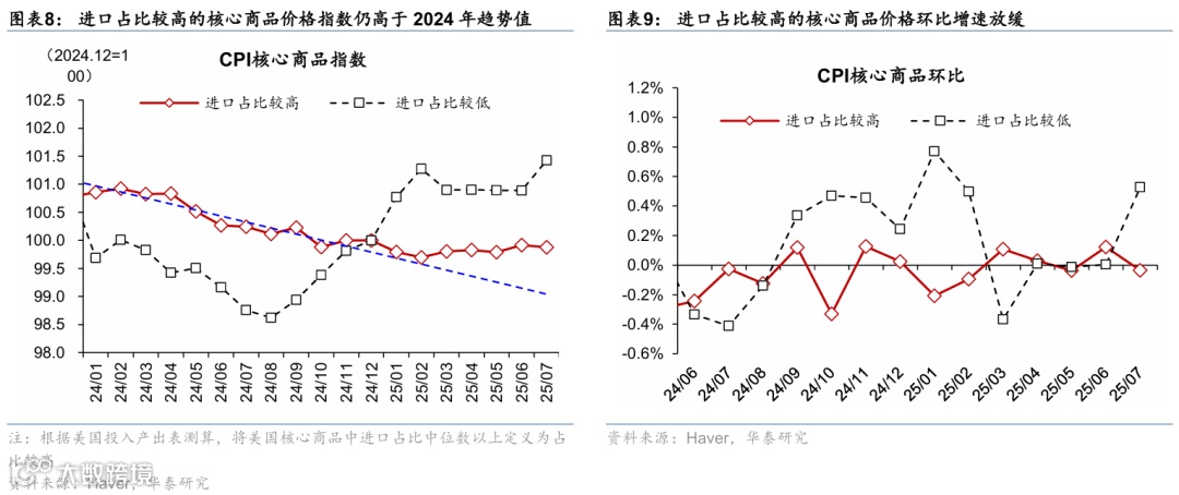 半粘性通胀方面,核心商品环比增速较6月仅上行0.01pp至0.21%,显示关税传导幅度不及预期;服装、家具、娱乐商品等受关税影响较大的分项价格增速略有放缓,仅新车、二手车价格等分项环比升温。服装、娱乐商品、家具等对进口依赖度较高的分项价格虽环比略有上行,但增速回落,环比增速分别下行0.36pp、0.35pp、0.28pp至0.07%、0.43%、0.7%,显示关税对通胀的传导幅度不及预期,背后原因可能是企业需求偏弱仅将50-60%的关税压力传导给消费者。新车与二手车价格增速转正,分别上行0.35pp、1.15pp至0.02%、0.48%,显示在厂商库存消耗,居民购车需求回升的情况下,价格有所改善,也与曼海姆二手车价格指数指示一致,但其指示8月二手车价格或有回落。
