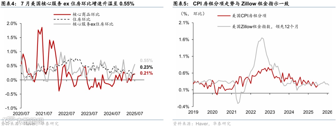粘性通胀方面,核心服务环比从6月的0.25%升至0.36%,其中医疗、运输分项明显回升,学校住宿及酒店降幅明显收窄。住房分项上行0.06pp至0.23%,主要是受到波动较大的学校住宿和酒店降幅收窄提振,房租上涨温和,等价租金边际降温,整体水平与市场化租金指数Zillow指示一致,预计后续或延续温和态势。核心服务ex住房明显升温,受运输服务(主要是机票)、医疗分项推动,环比增速分别上行0.63pp、0.23pp,此外,娱乐、教育等服务价格亦有所升温,分别上行0.18pp、0.06pp。