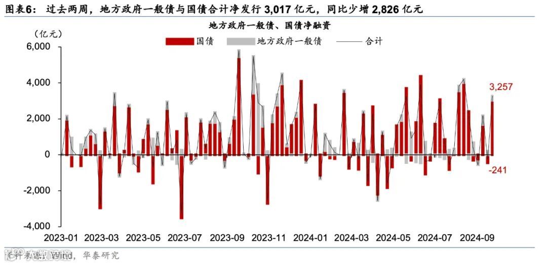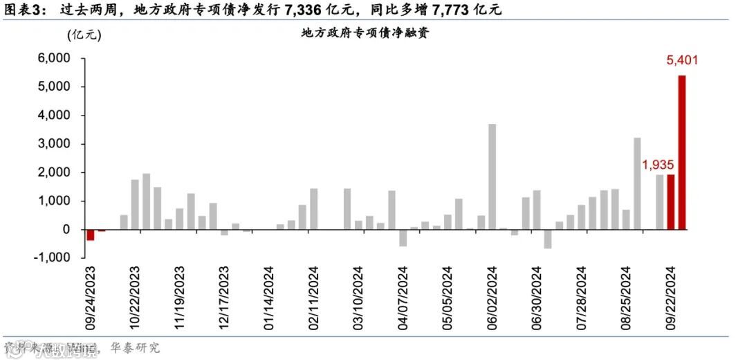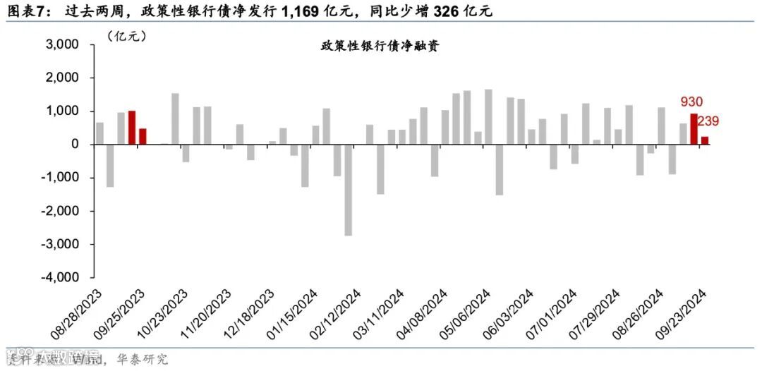 地方一般债及国债:过去两周,地方政府一般债与国债合计净发行3,017亿元,同比少增2,826亿元,而环比多增1,394亿元,其中国债净发行2,593亿元,同比少增2,861亿元,而环比多增1,291亿元;地方政府一般债净发行424亿元,环比边际提速(图表6)。9月至今,地方政府一般债和国债合计净发行4,639亿元,同比少增4,186亿元。年初至今,地方政府一般债与国债发行合计净融资3.96万亿元,同比多增1.04万亿元,其中国债同比多增1.05亿元,而地方政府一般债同比少增104亿元。
