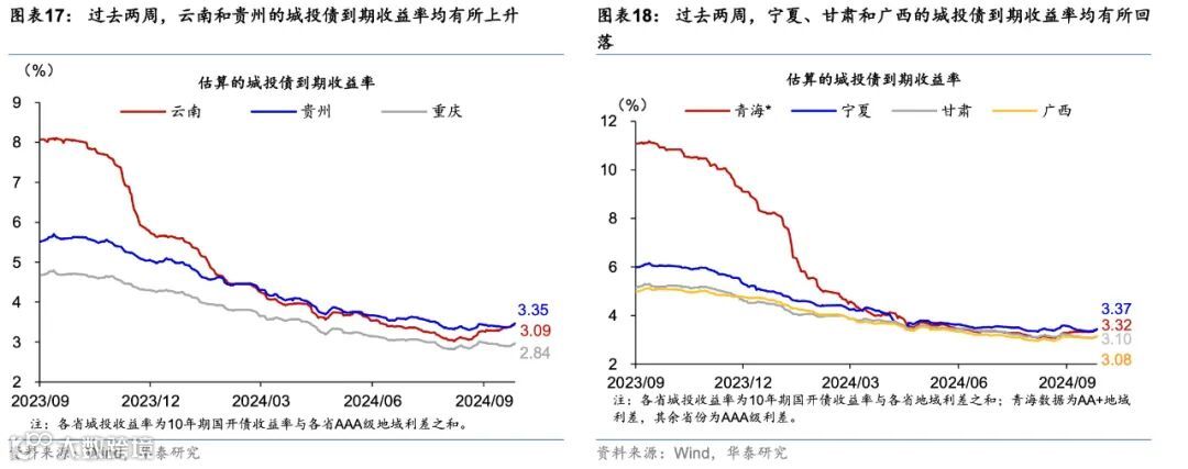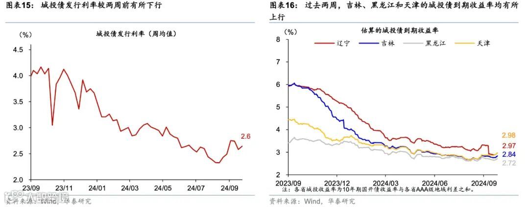 过去两周,全国城投债发行利率小幅下降至2.6%,自2023年6月末以来累计下降约220个基点。考虑地方化债中“债转贷”亦有助于降低融资成本,广义财政部门有效融资利率整体仍然延续下降趋势。过去两周,城投债发行利率从两周前的2.8%回落至2.6%左右(图表15)。分省层面,我们使用各省城投债的地域利差+10年期国开债到期收益率来估算各省城投债的到期收益率;过去两周,大多数重点化债省份的城投债到期收益率均呈回升态势,除受10年期国开债收益率上行拉动以外,各省地域利差均有所走阔,但仍处于低位。