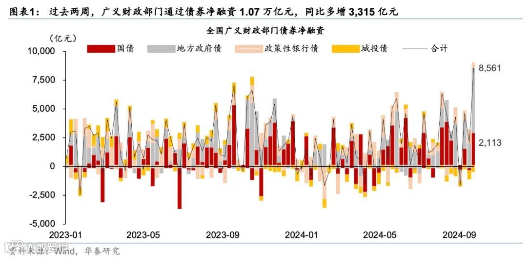 过去两周,广义财政部门债券净发行同环比均明显提速,主要由地方专项债加速发行拉动,显示财政政策有所发力。过去两周,广义财政部门净发行债券1.07万亿元,同、环比分别多增3,315亿元、7,618亿元,其中地方专项债净发行同、环比均明显多增,且今年前3季度发行进度达到全年额度的92.3%、较去年同期的91%边际提速,而国债、地方一般债和政策性银行债净发行亦边际提速,但城投债净赎回规模有所走阔。9月至今,广义财政部门债券净发行1.44万亿元,同比多增3,468亿元。年初至今,广义财政部门债券净发行约8万亿元,同比少增7,187亿元。
