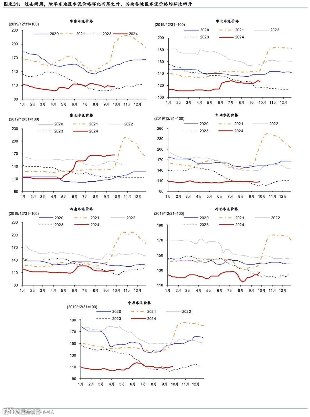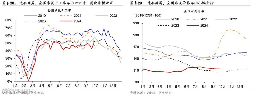 近两周,全国水泥开工率环比回升、同比降幅边际收窄;月底水泥供给开始新一轮错峰,供给端收紧或推动水泥价格小幅回升。供给端,全国水泥企业开工率较两周前环比小幅回升至49.7%,但仍低于往年同期,显示需求总体仍偏弱(图表28)。分区域看,华北、西北和西南地区水泥开工率环比回落,而其余各地区的水泥开工率均环比回升(图表30)。价格端,过去两周,全国水泥价格环比上行0.2%(图表29)。分区域看,过去两周,除华东地区水泥价格环比回落之外,其余各地区水泥价格均环比回升。