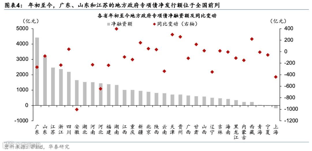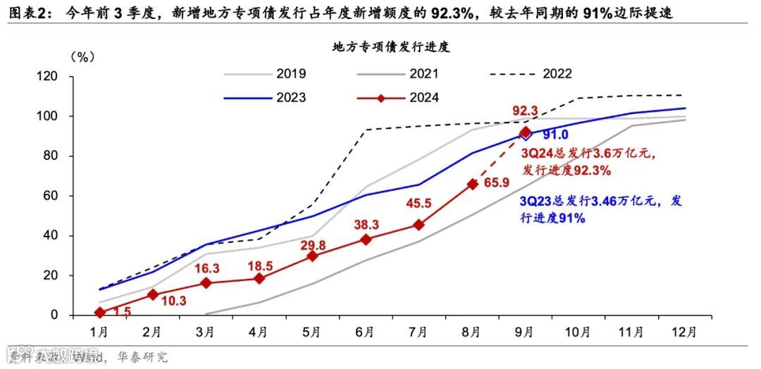 地方专项债:过去两周,地方专项债净发行7,336亿元,同、环比分别多增7,773亿元、5,399亿元。9月至今,地方政府专项债净发行1.1万亿元,同比多增9,590亿元。年初至今,各省市地方政府专项债累计净发行规模3.3万亿元,较去年同期多增572亿元,其中广东、山东和江苏的地方专项债净发行规模位于全国前列。从发行节奏看,今年前3个季度,新增地方专项债发行占年度新增额度的92.3%,较去年同期的91%边际提速(图表2-4)。