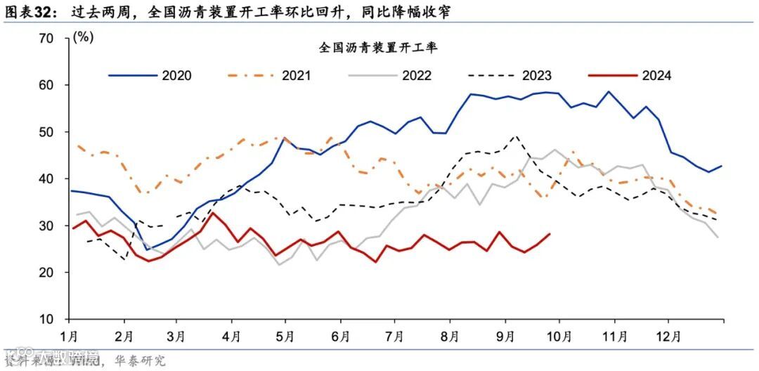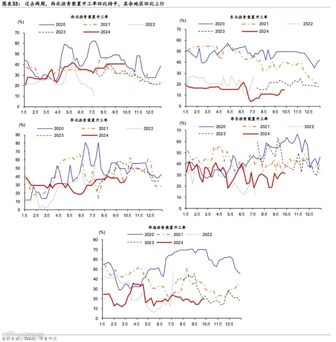 近两周,全国沥青装置开工率环比回升,同比降幅收窄。沥青是道路建设的主要用料。过去两周,全国沥青装置开工率环比上行3.9个百分点至28.2%,低于2021/2023年同期11.5/11.8个百分点(图表32)。分区域看,过去两周,西北地区沥青装置开工率环比持平,其余地区沥青装置开工率环比上行(图表33)。