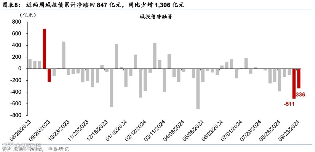 城投债:近两周,城投债累计净赎回847亿元,环比多减601亿元,同比少增1,306亿元(图表8)。9月至今,城投债累计净赎回1,459亿元,同比多减1,930亿元。年初至今,城投债累计净赎回3,609亿元,较去年同期多减1.38万亿元。