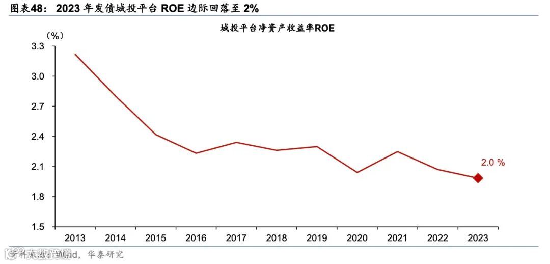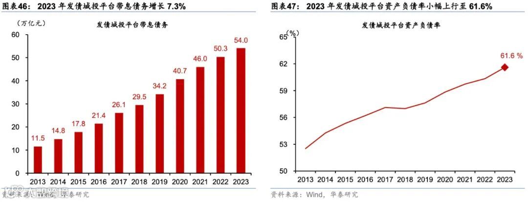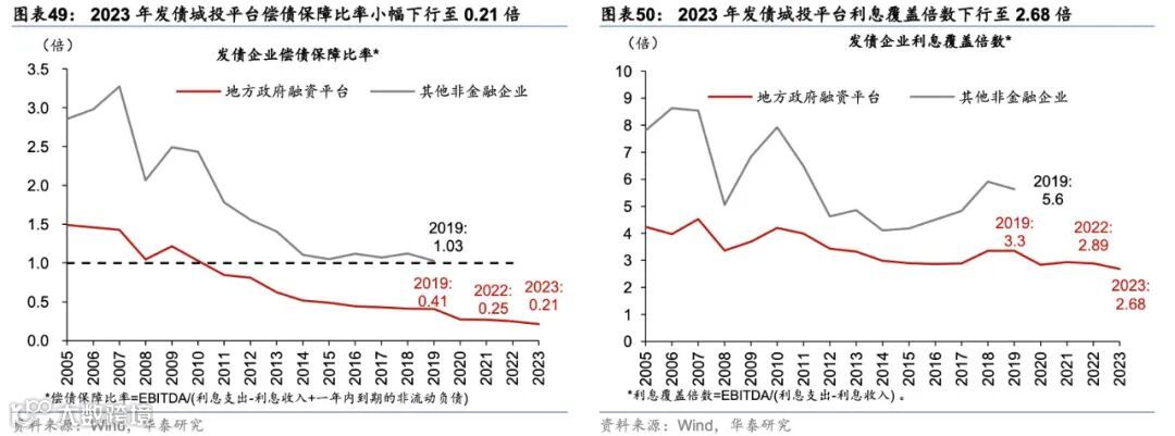 2023年城投平台的偿债能力有所承压。基于发债城投平台2023年的财务数据计算,发债城投平台总负债的扩张快于总资产,资产负债率小幅上行;净资产收益率同比边际回落,偿债保障比率与利息覆盖倍数均有所下行。