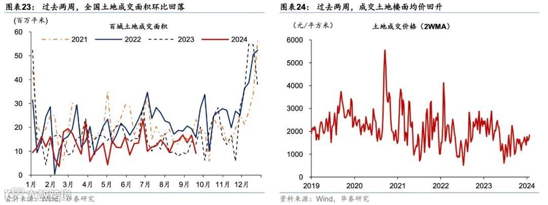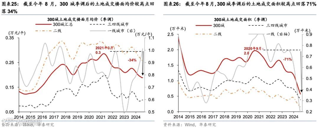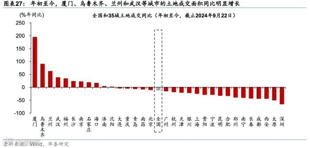 过去两周,全国土地成交量跌价升。具体看,过去两周,百城土地成交面积较两周前环比下行15.0%,较去年同期回落4.8%(图表23);成交土地楼面均价较两周前回升15.3%(图表24)。去年4季度以来,季调后的300城土地成交呈现量价齐跌态势(图表25和26)。截至2024年8月,300城土地成交面积/楼面月均价分别较高点回落71%/34%,其中今年1-8月300城土地成交金额累计同比回落52%。与此同时,土拍市场继续呈现向一线城市集中的趋势,自2023年以来,季调后的一线城市的土地成交价格回升较快。分省市看,年初至今,厦门的累计土地成交面积同比增长接近2倍,乌鲁木齐、兰州和武汉的累计土地成交面积同比也明显增长(图表27)。